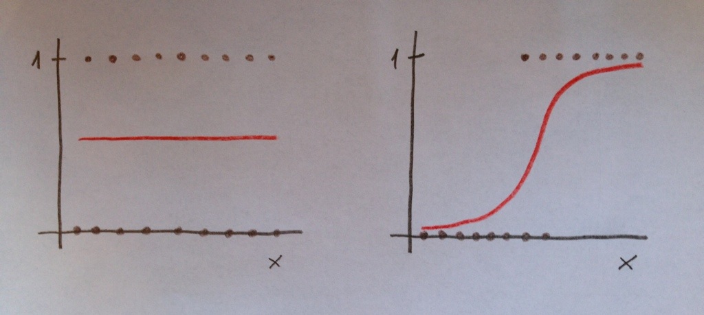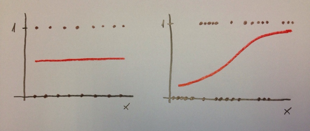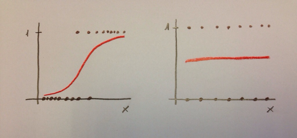 El modelo de la izquierda nos permite discriminar muy bien. Sin embargo, el modelo de la derecha no nos permite una buena discriminación. En el caso de la izquierda saber el valor de la variable «x» nos permite hacer una buena predicción de la variable dependiente. Ese valor discrimina. En el caso de la derecha el saber el valor de la variable «x» no nos informa. No discrimina.