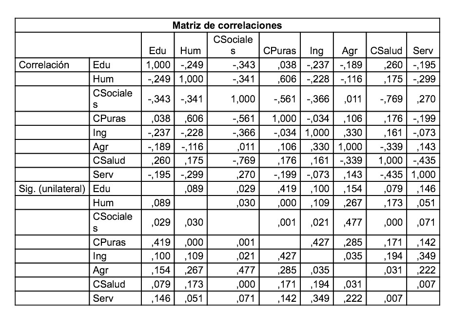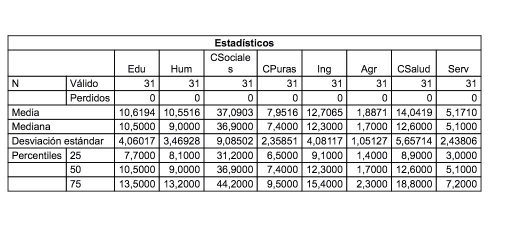 Como puede verse en la primera componente diferenciamos estados con con peso alto en Ciencias sociales y Servicios y peso bajo en Ciencias puras, Ciencias de la Salud y Humanidades de estados con lo contrario: peso bajo en Ciencias sociales y Servicios y peso alto en Ciencias puras, Ciencias de la Salud y Humanidades. En la segunda componente contrastamos estados con peso alto en Educación y bajo en Ciencias puras, Ingeniería y Agricultura con estados con lo contrario: peso bajo en Educación y alto en Ciencias puras, Ingeniería y Agricultura.