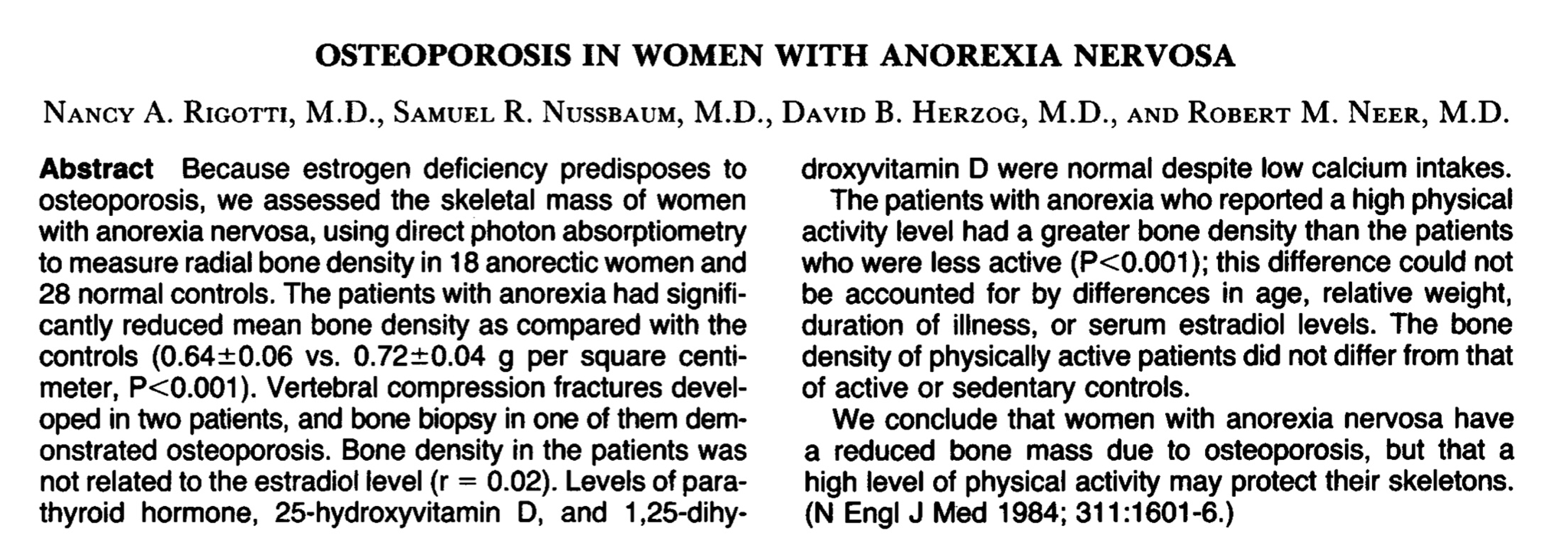 Como puede verse ya en el Abstract, se nos proporciona resúmenes descriptivos por grupo: se nos da la media y la desviación estándar de la densidad ósea en cada uno de los dos grupos principales del estudio (anoréxicas y controles), expresado como es habitual con el más/menos.