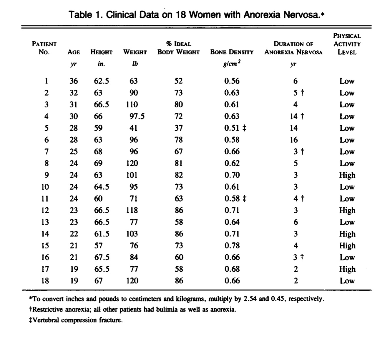 En una tabla del artículo se describen las características de las 18 pacientes con Anorexia nervosa. Esto es interesante como introducción a lo que una base de datos en estudios de este tipo. Es una matriz donde las filas son los pacientes y las columnas las distintas variables estudiadas: