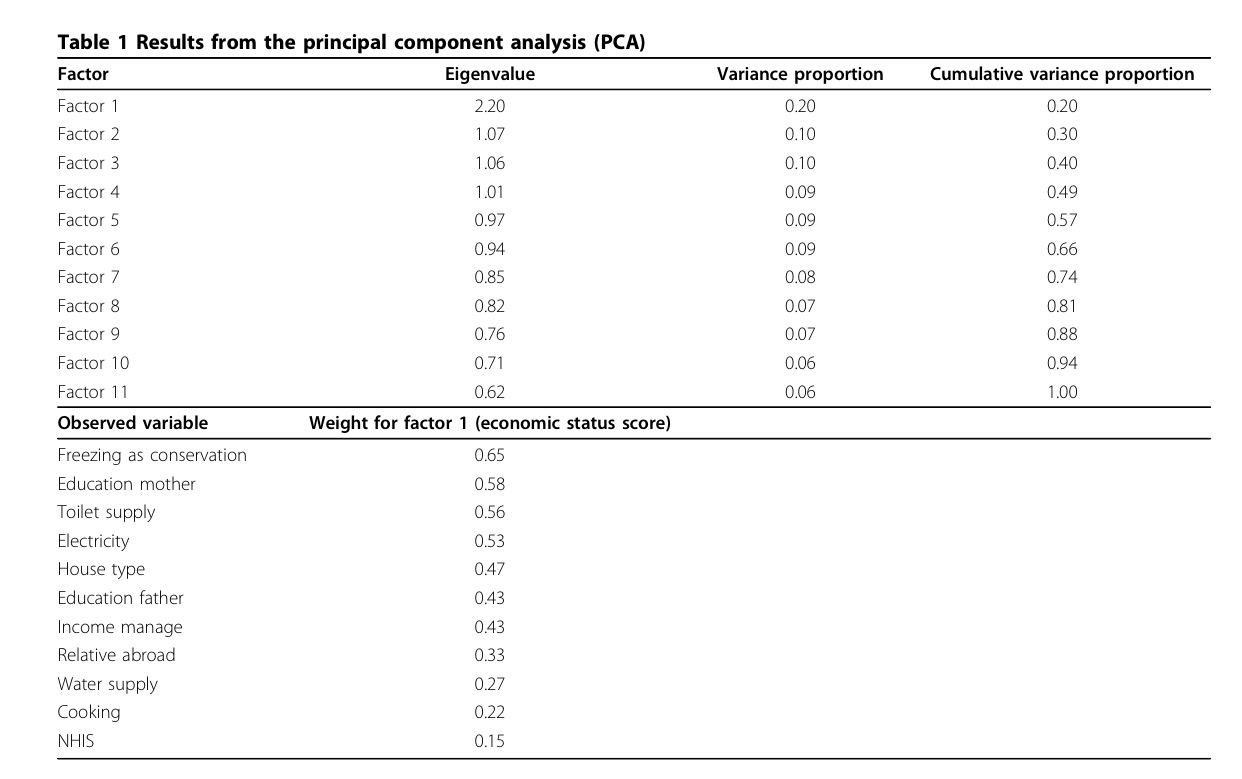 Ellos han trabajado con esta primera componente, que es la que explica más varianza y que, además, tiene gran interés para lo que persigue el estudio. Suma todas las variables originales. Con pesos un poco diferentes, es cierto, pero siempre con el coeficiente positivo. Lo que nos separa las personas con buen o con mas nivel socioeconómico evaluado por esas 11 variables originales. Quien tiene más comunidades de las enunciadas en las diferentes variables es el que puntúa más en la componente. Por lo tanto, esta componente evalúa el nivel socioeconómico pesando mediante esos coeficientes las 11 variables originales.