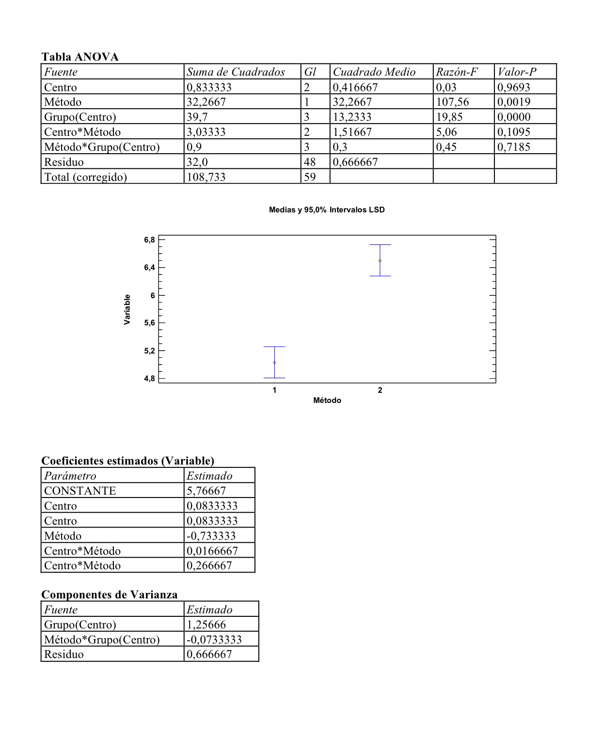 «Centro» es un factor fijo, «Método» también. «Grupo», anidado dentro de «Centro», es aleatorio. «Método» está cruzado con «Centro» y con «Grupo».