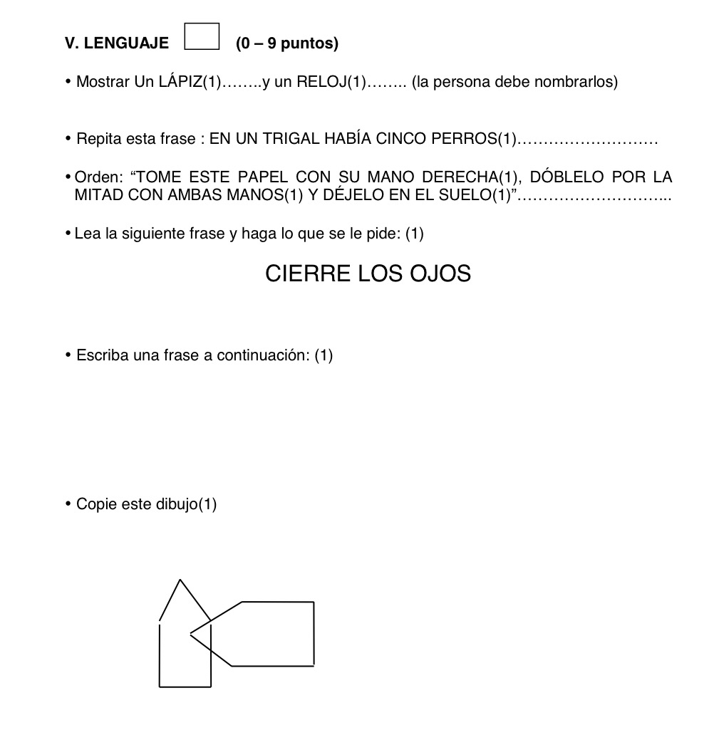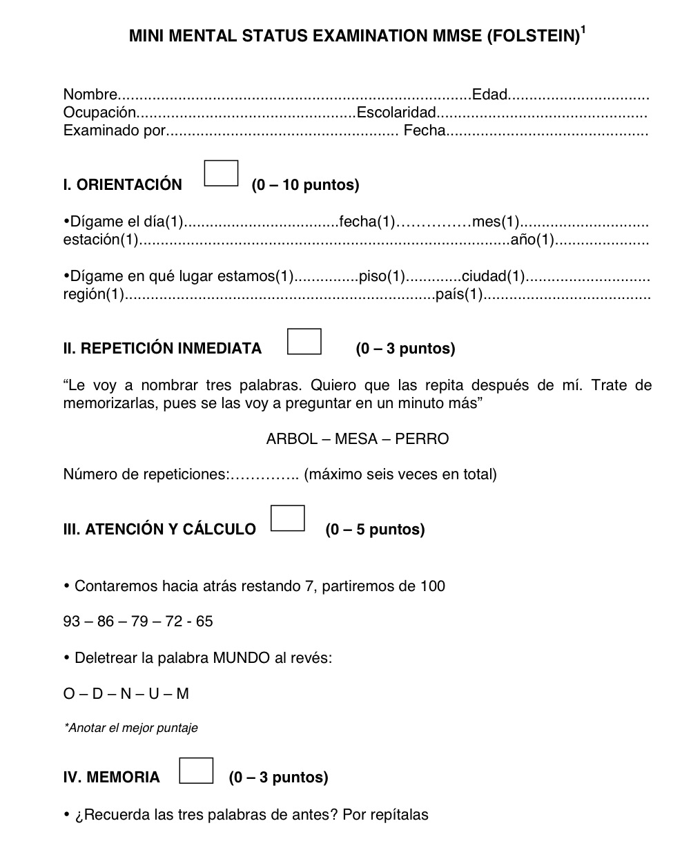 Para quien quiera ver el Mini-Mental aquí lo tiene. Se puntúa del 0-30. Entre 27 y 30 se considera un valor normal. A partir de ese intervalo y cuando más bajo sea el valor más importante es el deterioro cognitivo: