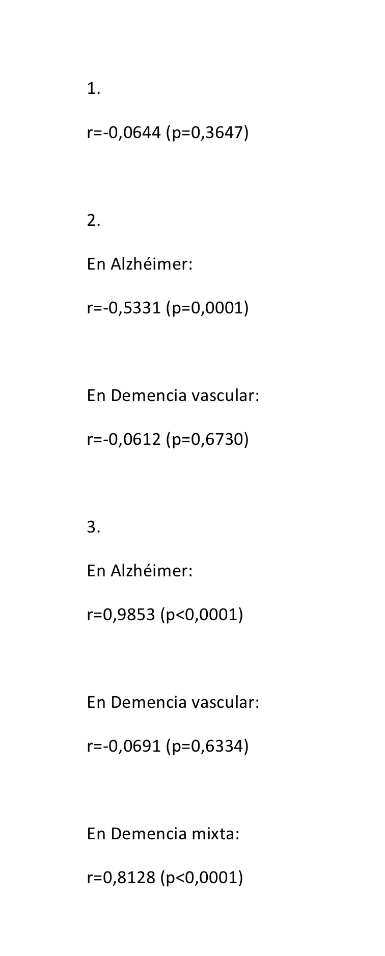2. Calcular la correlación entre Edad y Diferencia de Mini-Mental a los 3 años de diagnóstico menos Mini-Mental en el diagnóstico en los pacientes con Alzhéimer, por un lado, y en los pacientes con Demencia vascular, por otro. ¿Qué parecen apuntar estos resultados?