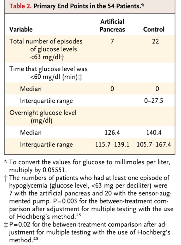 Se trata de un estudio donde se ensaya la implantación de un páncreas artificial. Para ello se toman 54 niños en un campamento para diabéticos y en dos noches se les trata de dos formas distintas. Una noche mediante el tratamiento habitual mediante insulina y otra noche mediante el páncreas artificial. Se analiza si durante la noche han tenido o no una hipoglucemia, que es la situación más grave que puede padecer un diabético. Como puede verse, con el páncreas artificial 7 de los 54 han padecido una hipoglucemia. Sin embargo, cuando estaban siendo tratados con la insulina, el tratamiento control, se produjeron 22 hipoglucemias. Es evidente que es distinto 7 de 22. Matemáticamente distinto. Pero lo que hace falta es ver si es una diferencia significativa, si es una diferencia estadísticamente significativa.