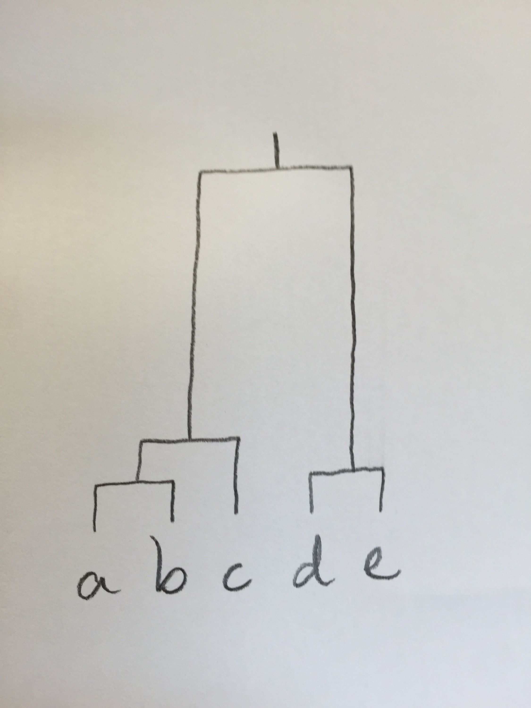 14. Si tenemos una muestra de cinco pacientes (a, b, c, d, e) a los que les hemos medido una única variable cuantitativa y de la cual tenemos el siguiente dendrograma, obtenido mediante un Análisis clúster: