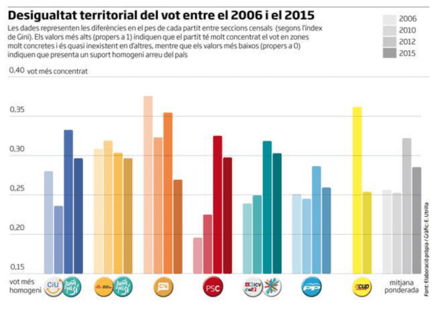 En este gráfico se muestran, en un periódico, una valoración de cómo ha ido evolucionando la distribución de votos en Cataluña en las últimas elecciones autonómicas:
