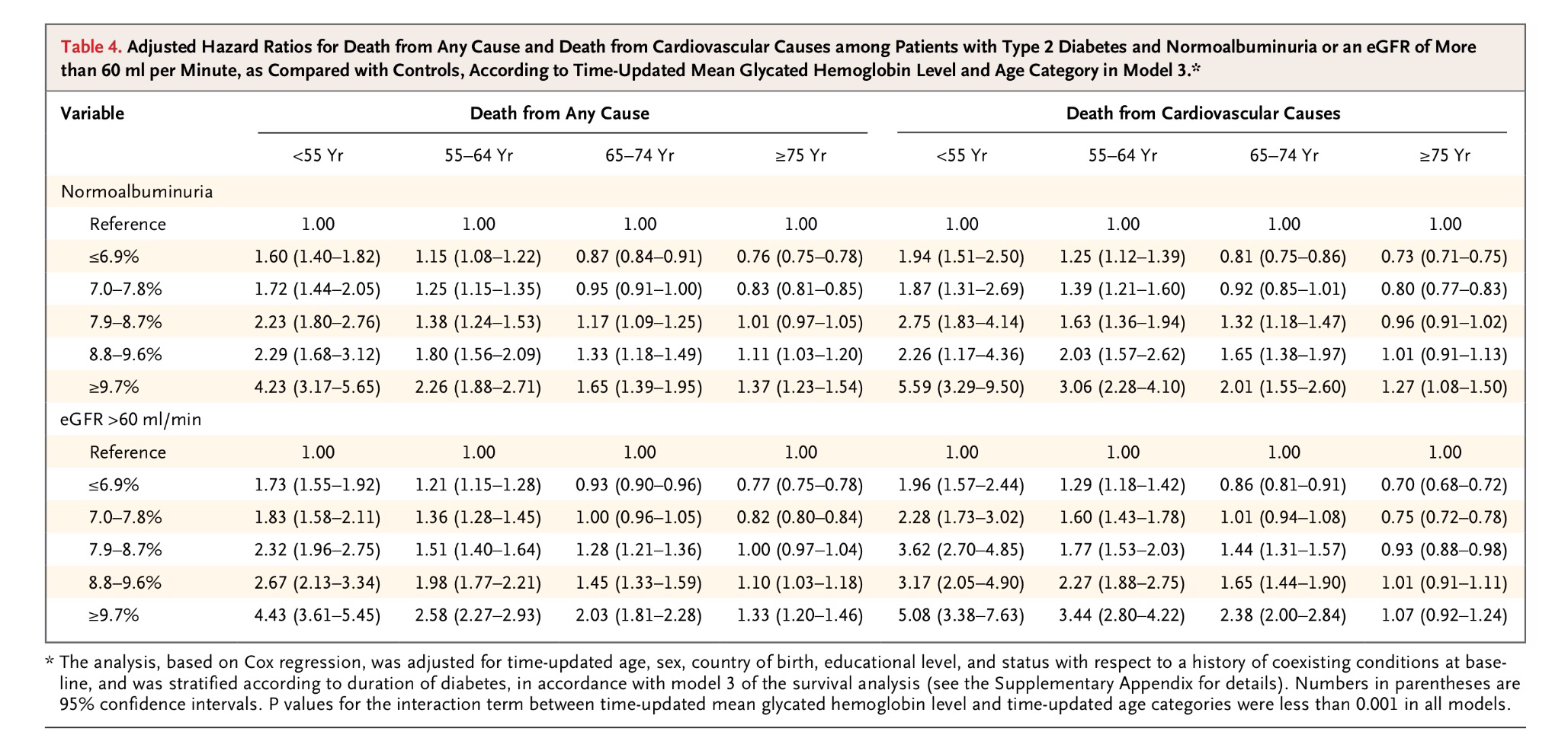 A continuación tenemos las hazard ratio según edad y otros factores de riesgo y atendiendo a mortalidad por cualquier causa y a mortalidad por causa cardiovascular: