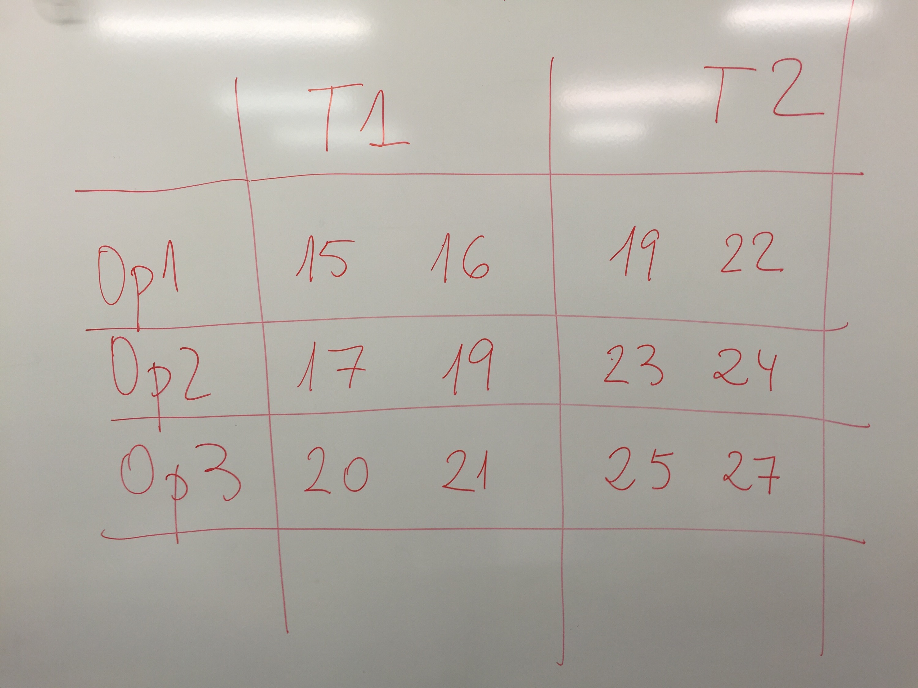 Supongamos que queremos ensayar dos técnicas concretas diferentes (T1 y T2) para evaluar un determinado parámetro sanguíneo y queremos, además, ver cómo influye, en la variación del resultado, el operario. Para ello se toman tres operarios al azar entre los muchos del laboratorio. Se toma una misma muestra y cada operario hace la medición con las dos técnicas haciendo dos réplicas. Los resultados son los siguientes: