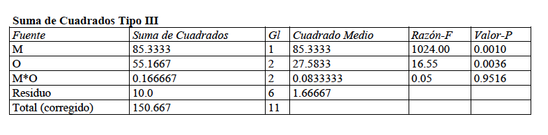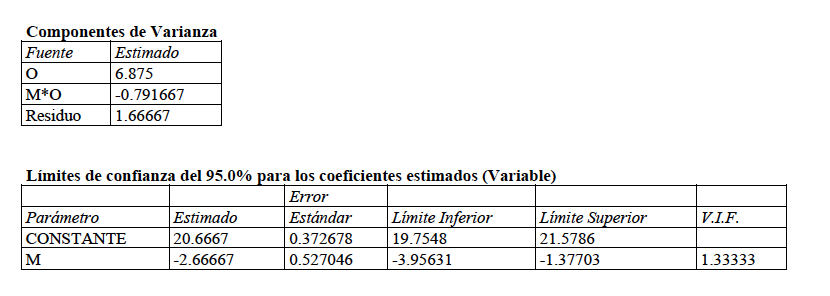 Observemos que al ser un ANOVA de factores mixtos (uno fijo y uno aleatorio) los cociente de cuadrados medios son los que aparecen en la tabla.