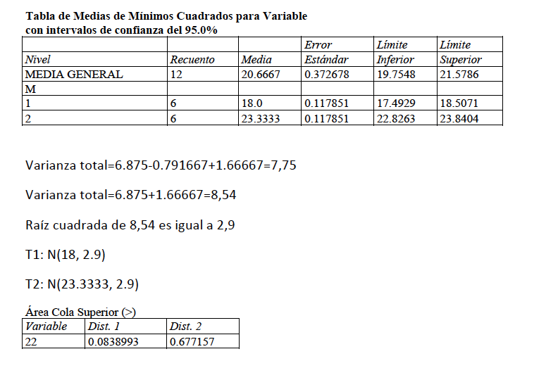 Si ahora quisiéramos calcular la probabilidad de que la T1 ó la T2 dé valores por encima, por ejemplo, de 22, deberíamos ver con qué distribución normal debemos trabajar. La media la tomaríamos estimando la media de cada una de las dos técnicas y respecto a la varianza total hay dos opciones, como se puede ver: Considerar la de la interacción como 0 ó como el valor negativo que surge de la estimación. Me he inclinado por la primera opción, como puede verse a continuación: