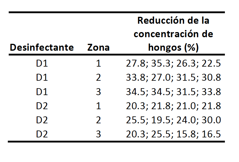 2. Se quiere evaluar la reducción de la contaminación ambiental por hongos en salas hospitalarias mediante dos mecanismos de desinfección diferentes. Para ellos se toman dos salas diferentes, en un mismo hospital, pero dos salas de un nivel de contaminación similar. Se elige, al azar, en cada una de esas dos salas, tres zonas donde realizar la desinfección y la posterior toma de muestra. En cada zona se evalúan cuatro recuentos de hongos para evaluar la reducción de la concentración inicial. Los datos de reducción obtenidos son los siguientes: