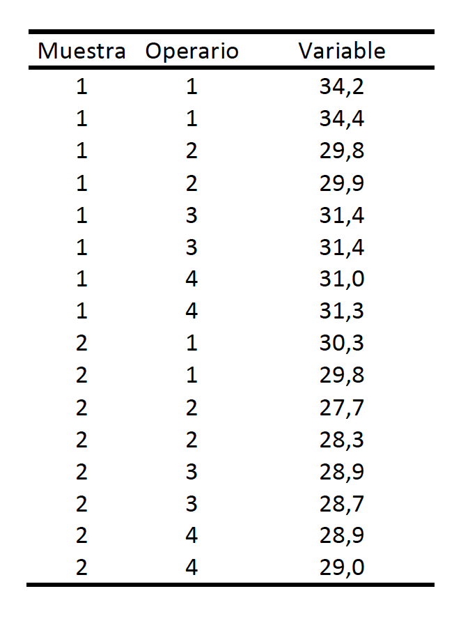 3. Se quiere saber la contribución a la variabilidad que introducen tanto la toma de la muestra ante el paciente como la intervención de los operarios en el laboratorio en el análisis de un determinado parámetro del líquido cefalorraquídeo. Para ello se hace a un mismo paciente dos tomas de muestra y cada una de ellas se divide en 8 submuestras. Se eligen al azar 4 de los operarios que trabajan habitualmente en ese laboratorio. Cada operario realiza el análisis a dos submuestras de cada una de esas dos muestras. Los resultados obtenidos son los siguientes:
