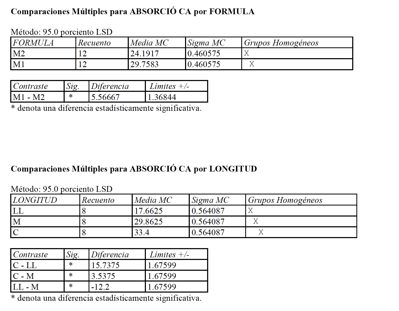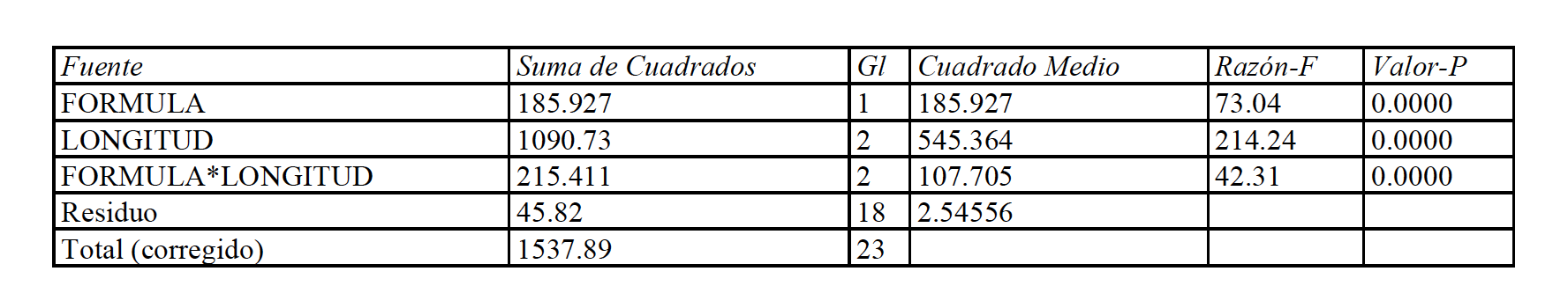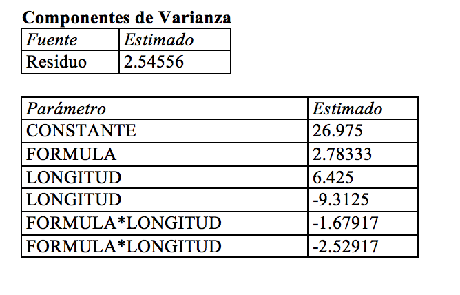 Esta tabla ANOVA nos muestra que hay diferencias entre los niveles del factor Fórmula, entre los niveles del factor Longitud y que hay interacción significativa, también. La estimación de los parámetros del modelo son los siguientes: