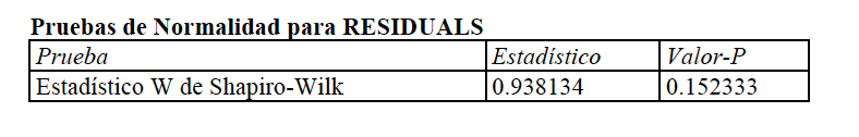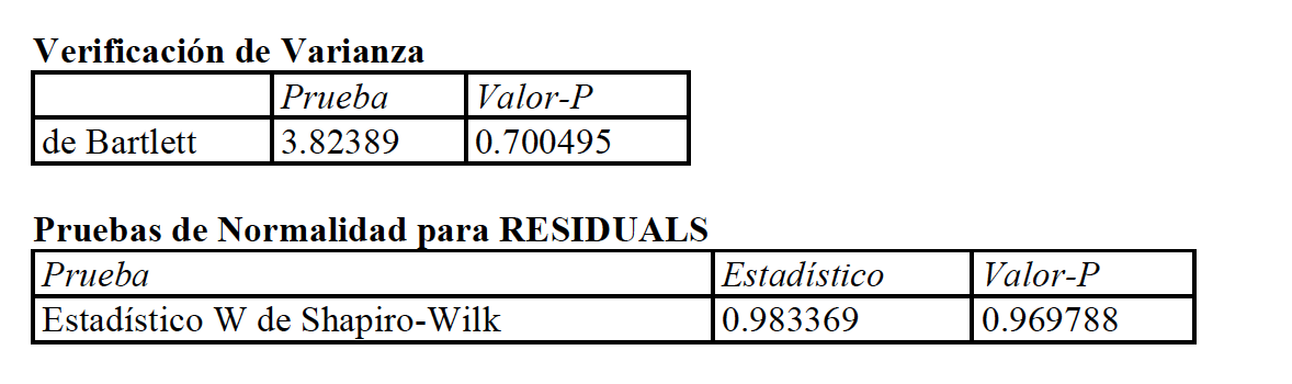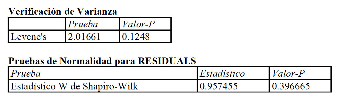 Y, finalmente, si se quisiera comprobar el cumplimiento de las suposiciones: la igualdad de varianzas y la normalidad, haríamos los dos siguientes contrastes que muestran que se cumplen las condiciones del modelo ANOVA usado: igualdad de varianzas y normalidad: