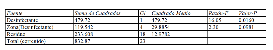 2. Se trata de un modelo de dos factores anidados mixtos. El factor Desinfectante es fijo y el factor Zona es aleatorio y anidado en el factor Desinfectante. Ver ANOVA de dos factores anidados mixtos. Se han tomado dos desinfectates concretos por lo que se trata de un factor fijo, pero las zonas se han elegido al azar en cada una de las dos salas por lo que se trata de un factor aleatorio. Además, se trata, la zona, de un factor anidado puesto que se toman zonas que están sólo en una sala.