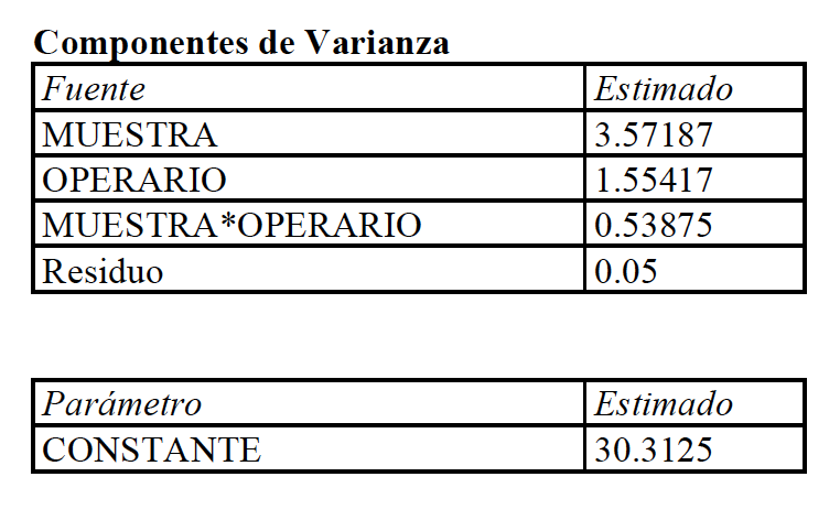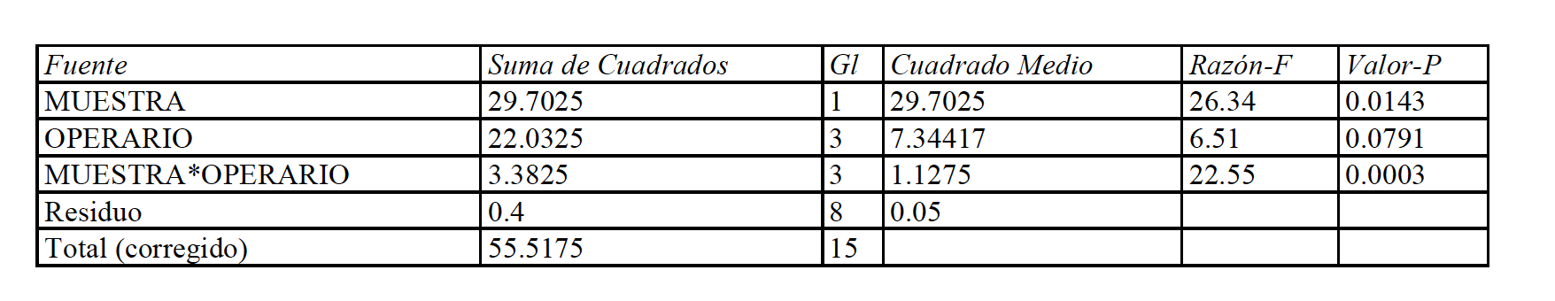 Aquí podría ser controvertido si tomar el valor de 1.55 ó no tomarlo, puesto que el contraste de hipótesis nos ha salido no significativo. Lo he tomado porque, aunque no significativo, algún efecto estimamos que está aportando el operario.