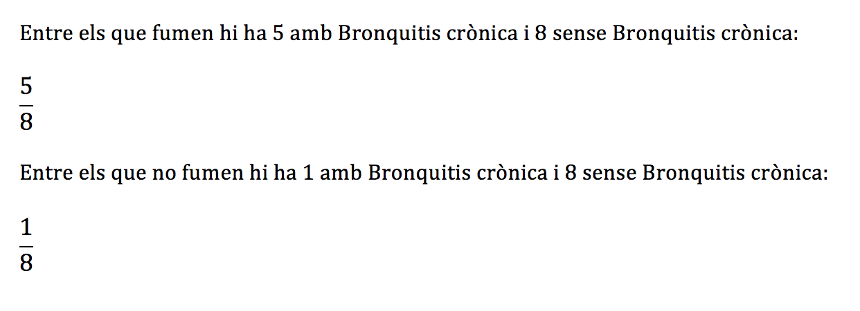 Això vol dir que hi ha 5 vegades més Bronquitis crònica entre els fumadors que entre els no fumadors. En aquest cas diem que fumar és un factor de risc per tenir Bronquitis crònica.
