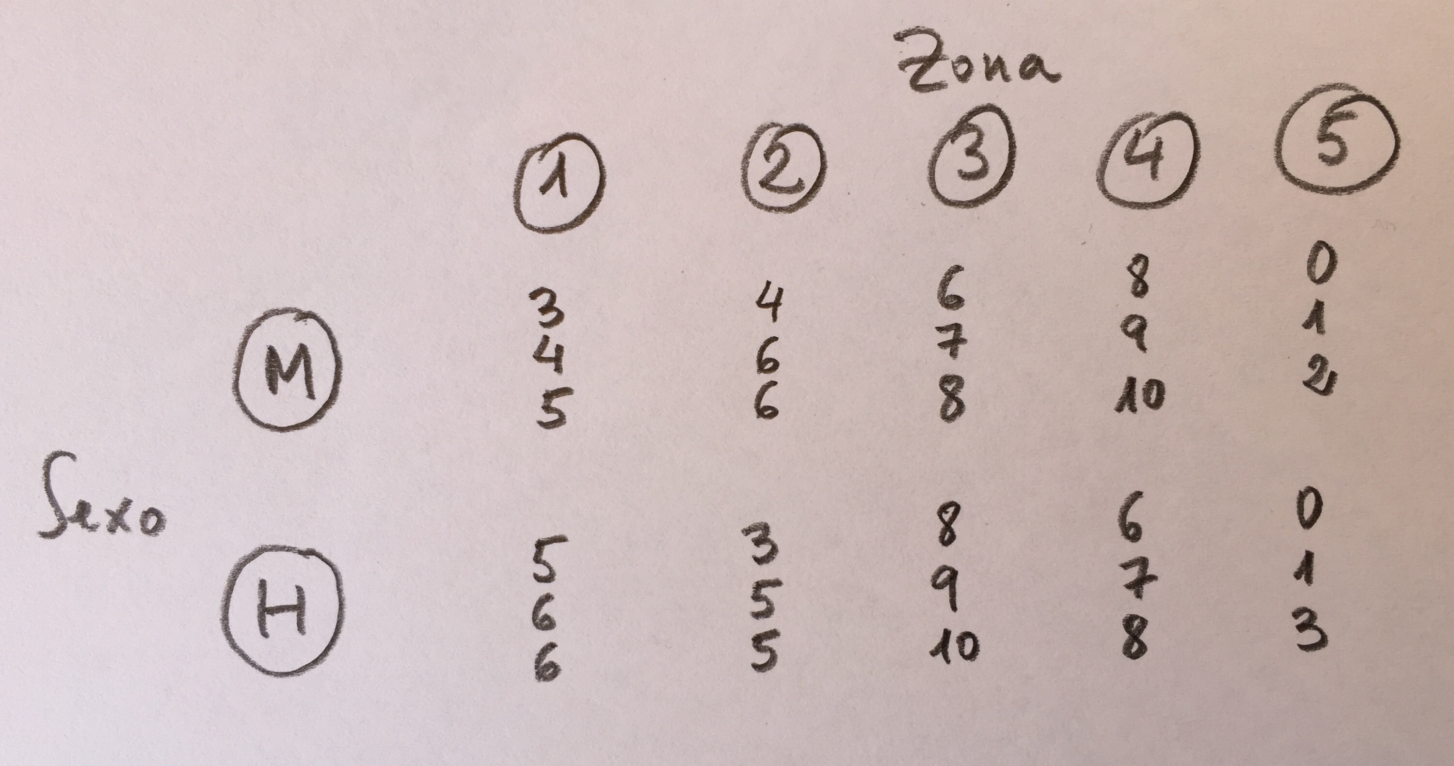 10.Se ha hecho un estudio de valoración de un producto entre el 1 y el 10 en cinco zonas y en los dos sexos. Los resultados obtenidos son los siguientes: