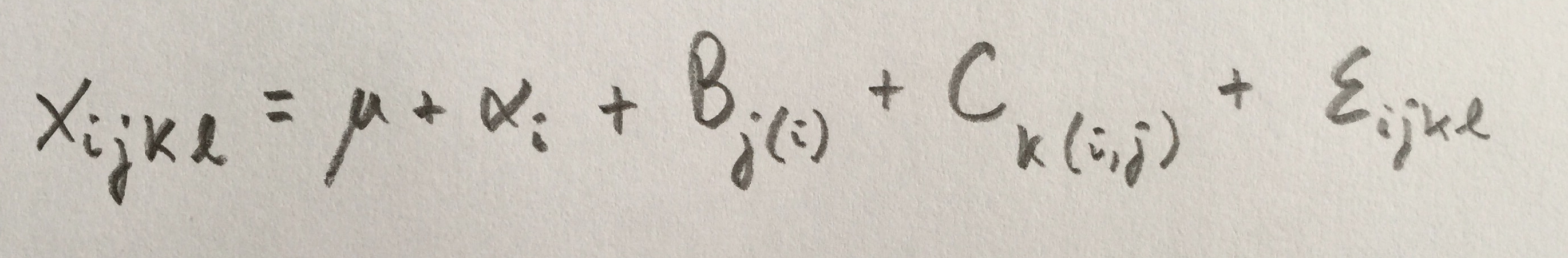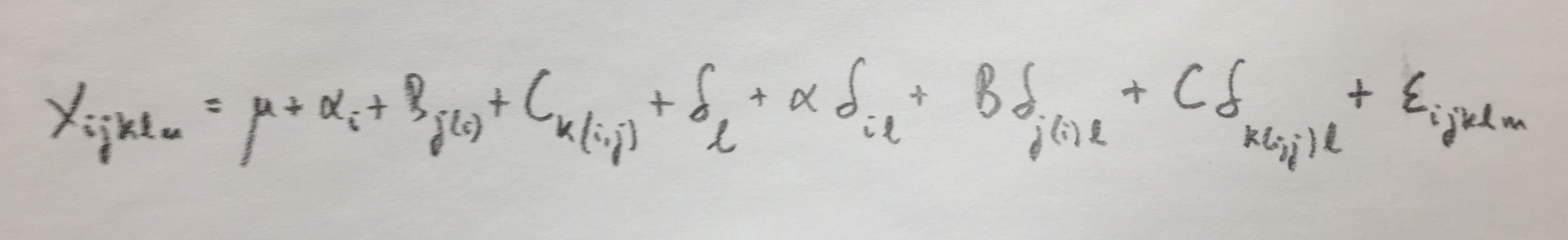 5.Estamos ante un diseño con cuatro factores. El factor zona es fijo. El factor subzona es aleatorio y anidado en el factor zona. El factor operario es también aleatorio y anidado en subzona. El factor técnica es fijo y cruzado con los otros tres factores. El modelo sería: