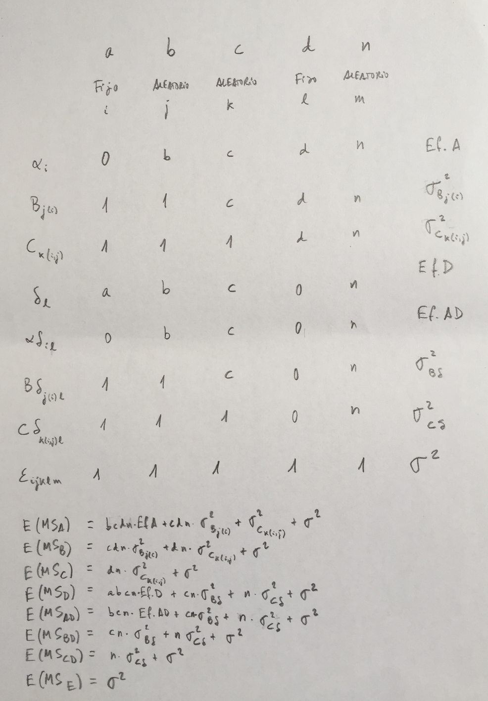 El algoritmo de Bennet-Franklin nos proporciona las esperanzas de los cuadrados medios y n los cocientes que hay que hacer en la tabla ANOVA para encontrar los efectos significativos del modelo: