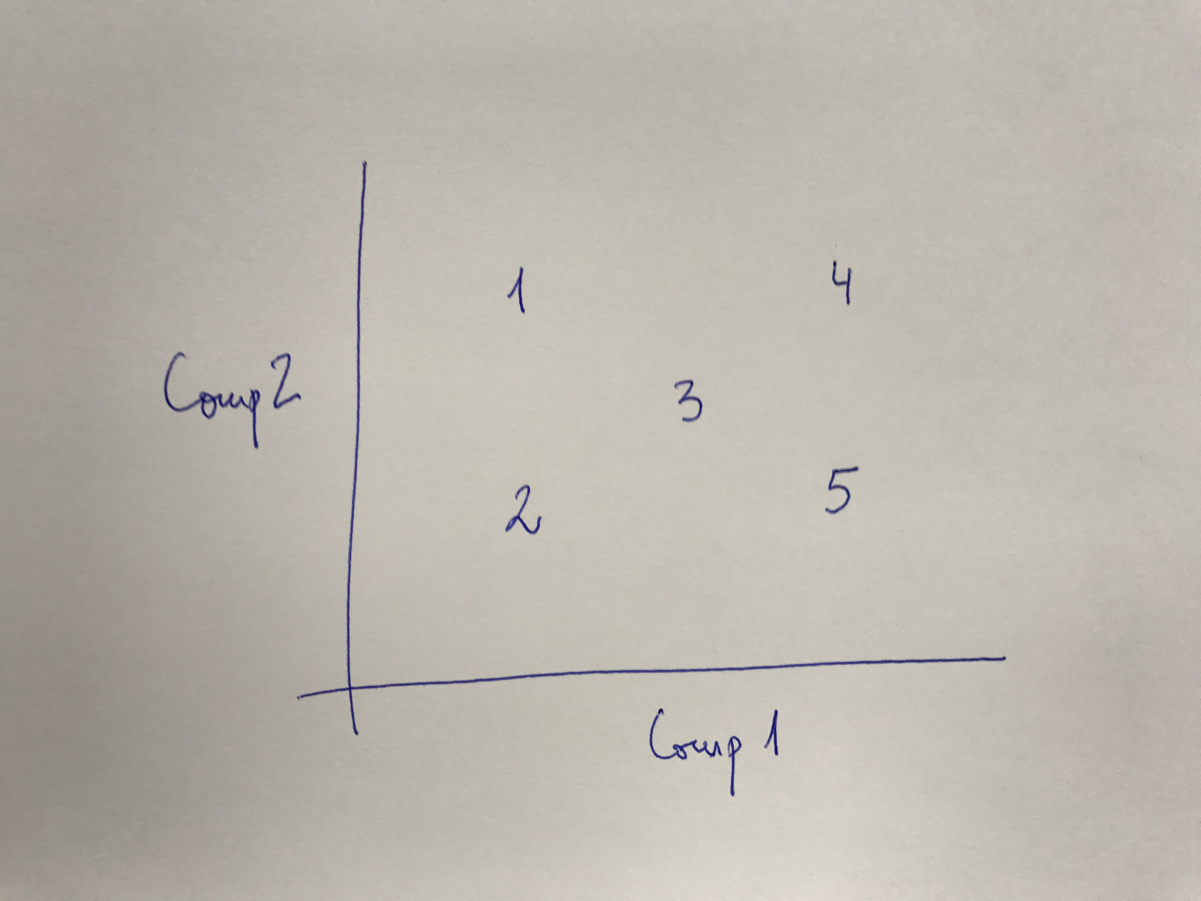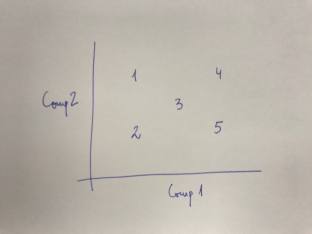 6.Hemos realizado un Análisis de componentes principales a una base de datos con cinco variables obteniendo dos componentes que explican un 85% de la información. La primera componente es Y1=0.5X1+0.5X2+0.5X3+0.5X4+0.5X5 y la segunda componente es Y2=0.5X1-0.01X2-0.01X3-0.5X4+0.01X5. En el siguiente gráfico de las dos primeras componentes principales, ¿cuál es el individuo 5?