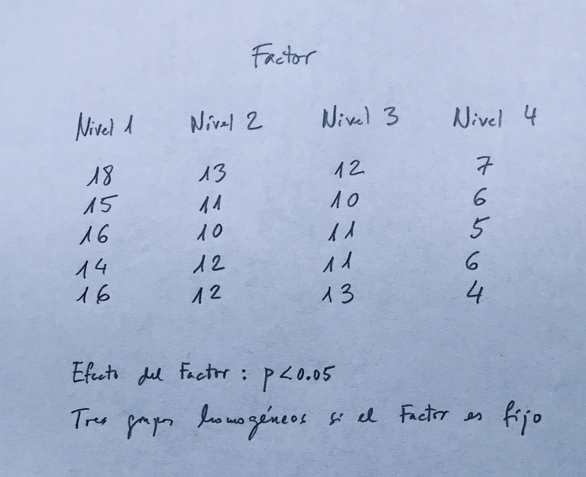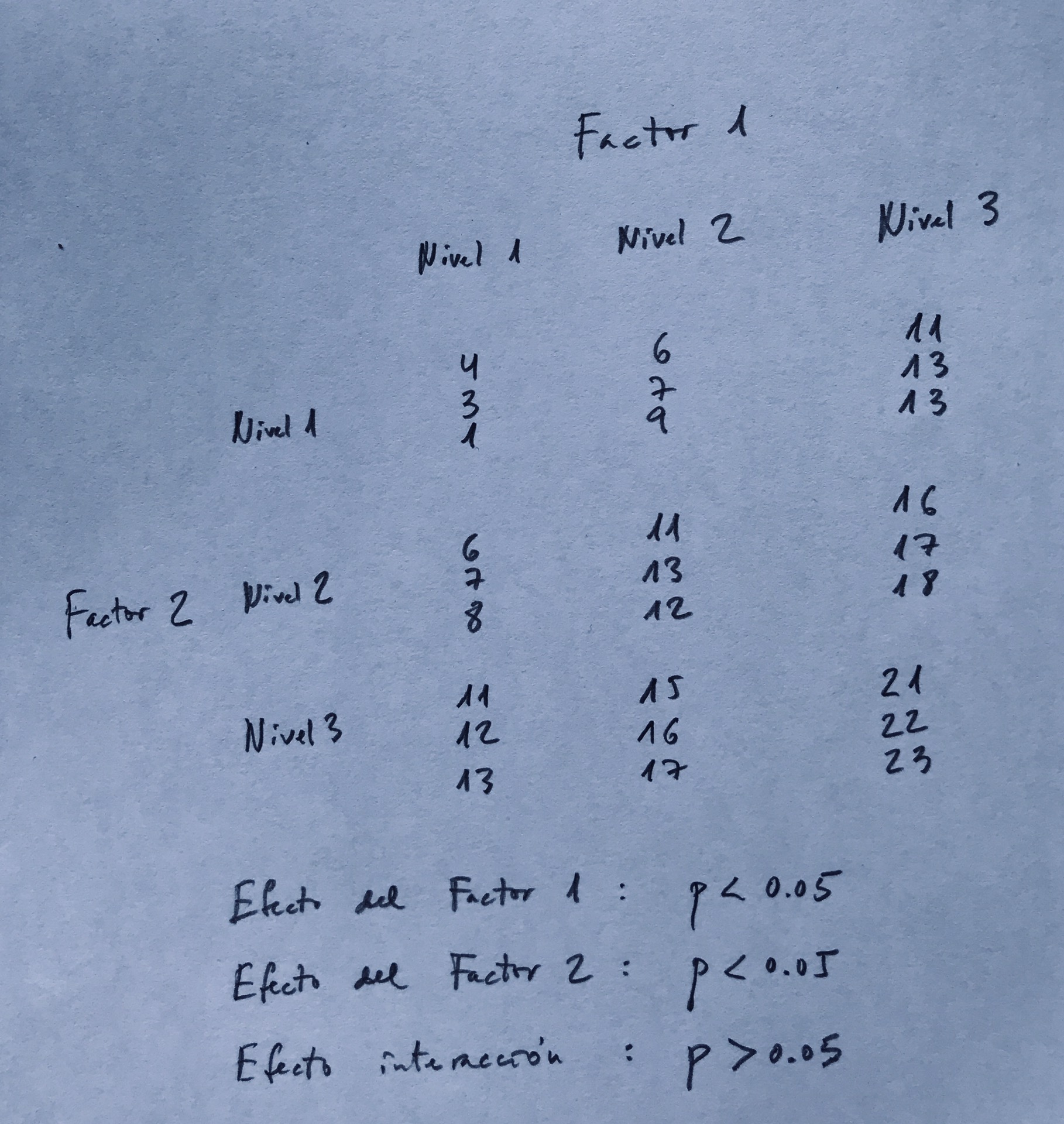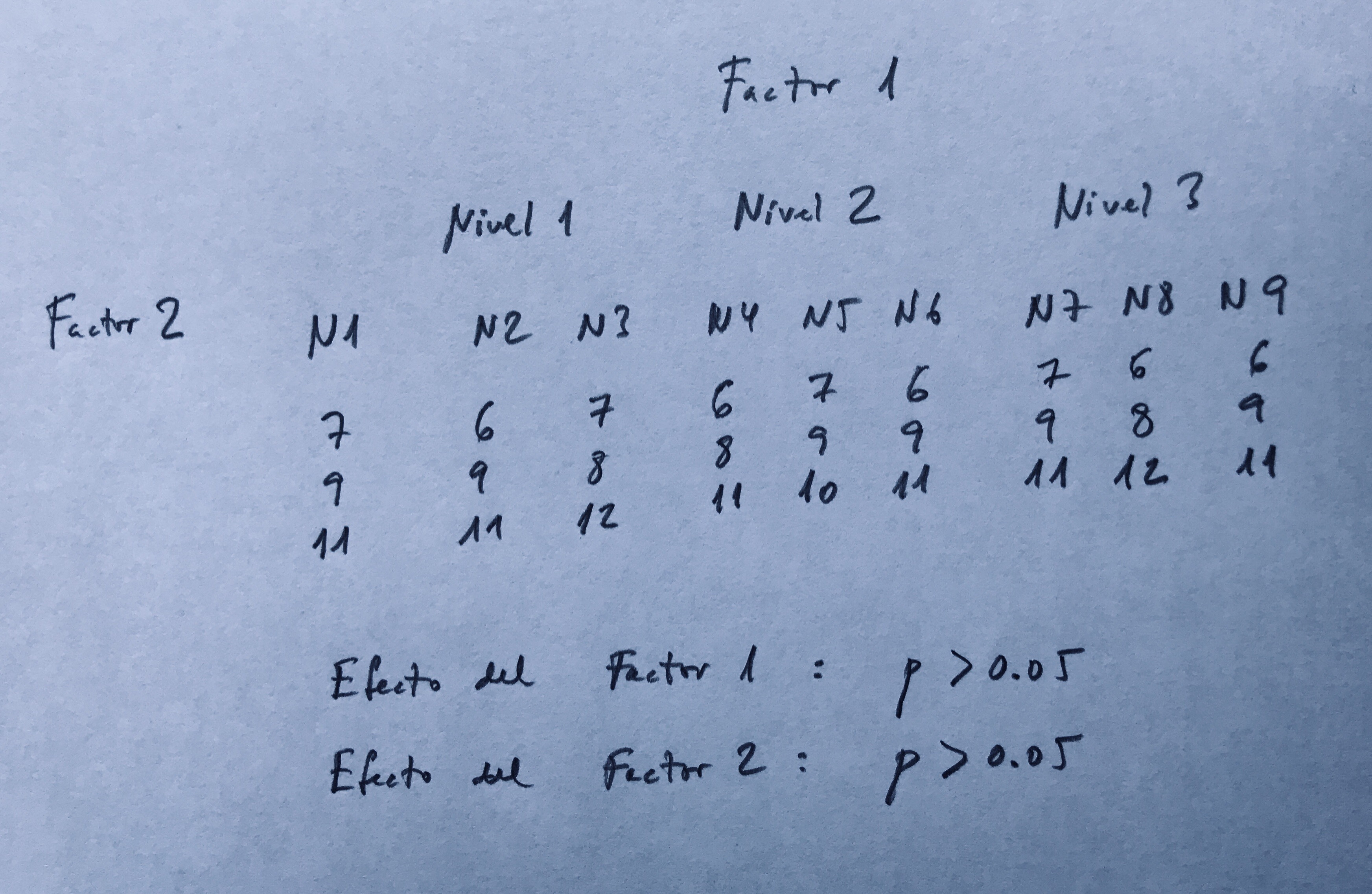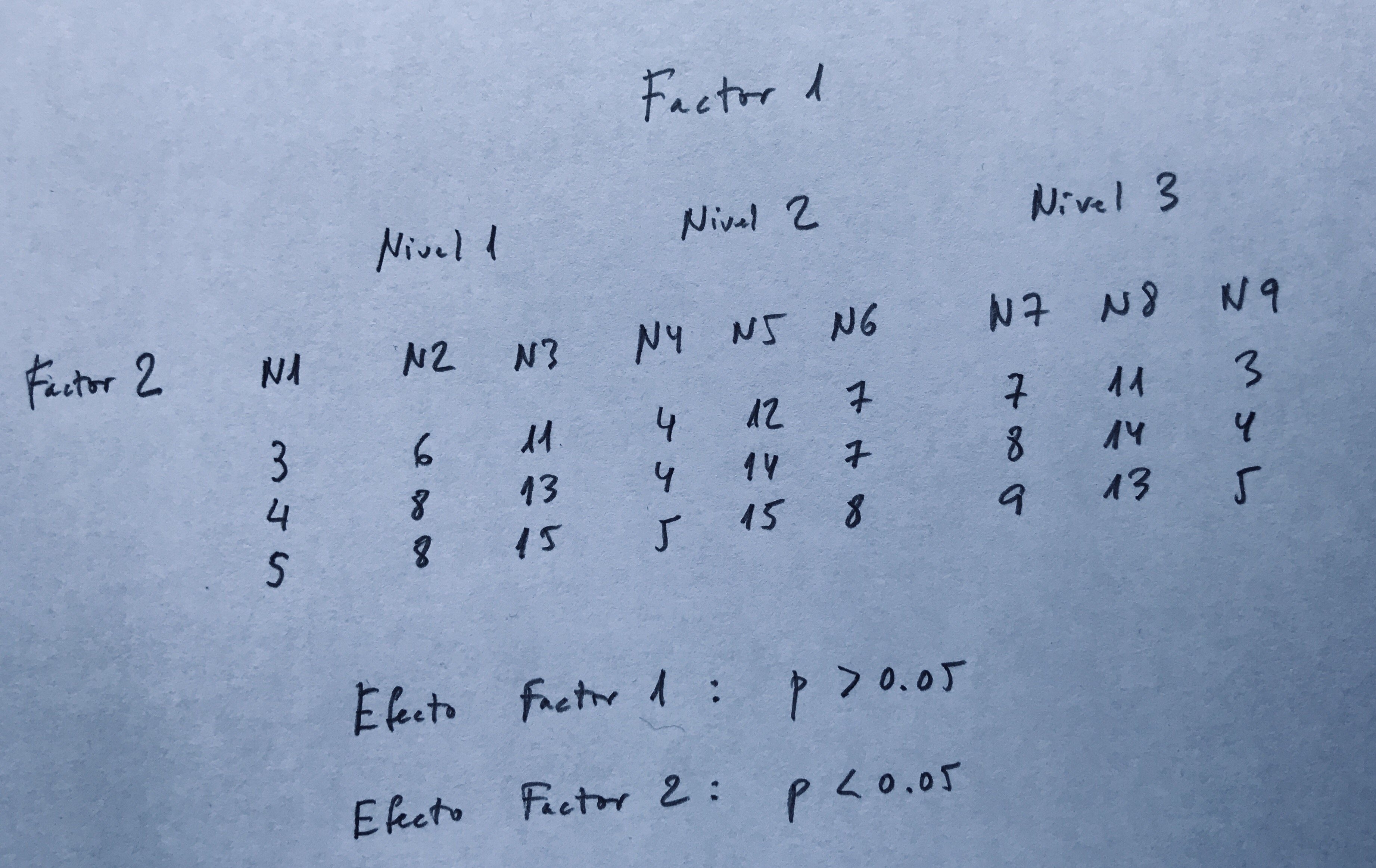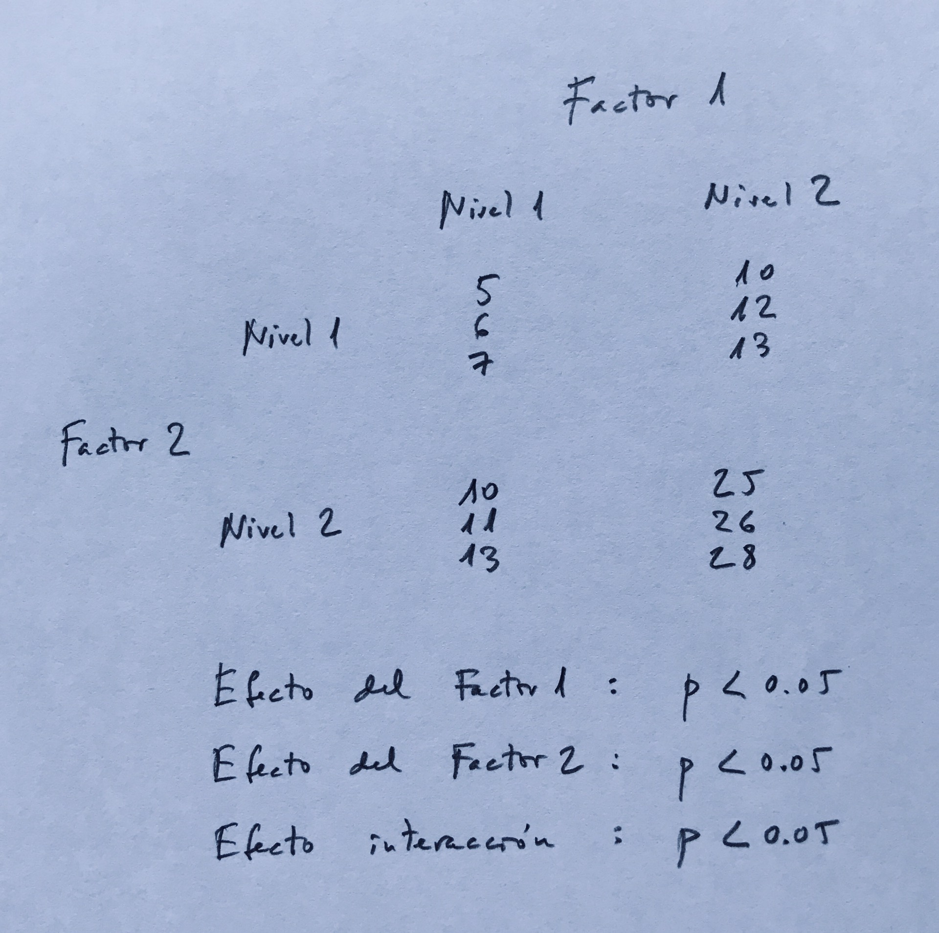 A continuación se podrán seguir una serie de ejemplos de ANOVA. Hay de factores cruzados, anidados. Factores intersujetos (los que no se mencionan expresamente), factores intrasujetos. Pueden verse los valores y los resultados que se obtendrían en los contrastes de hipótesis de los diferentes efectos a buscar en cada análisis. Recordemos que si el p-valor es menor de 0.05 se entiende que hay efecto del factor, significativo, lo que quiere decir que hay diferencia entre los niveles estudiados (si el factor es fijo) o entre la población de niveles de los que los niveles estudiados son una muestra (si el factor es aleatorio). Si el p-valor es mayor de 0.05 no hay efecto significativo, lo que quiere decir que las posibles diferencias muestrales que podamos ver entre los diferentes niveles no son extrapolables a la población.