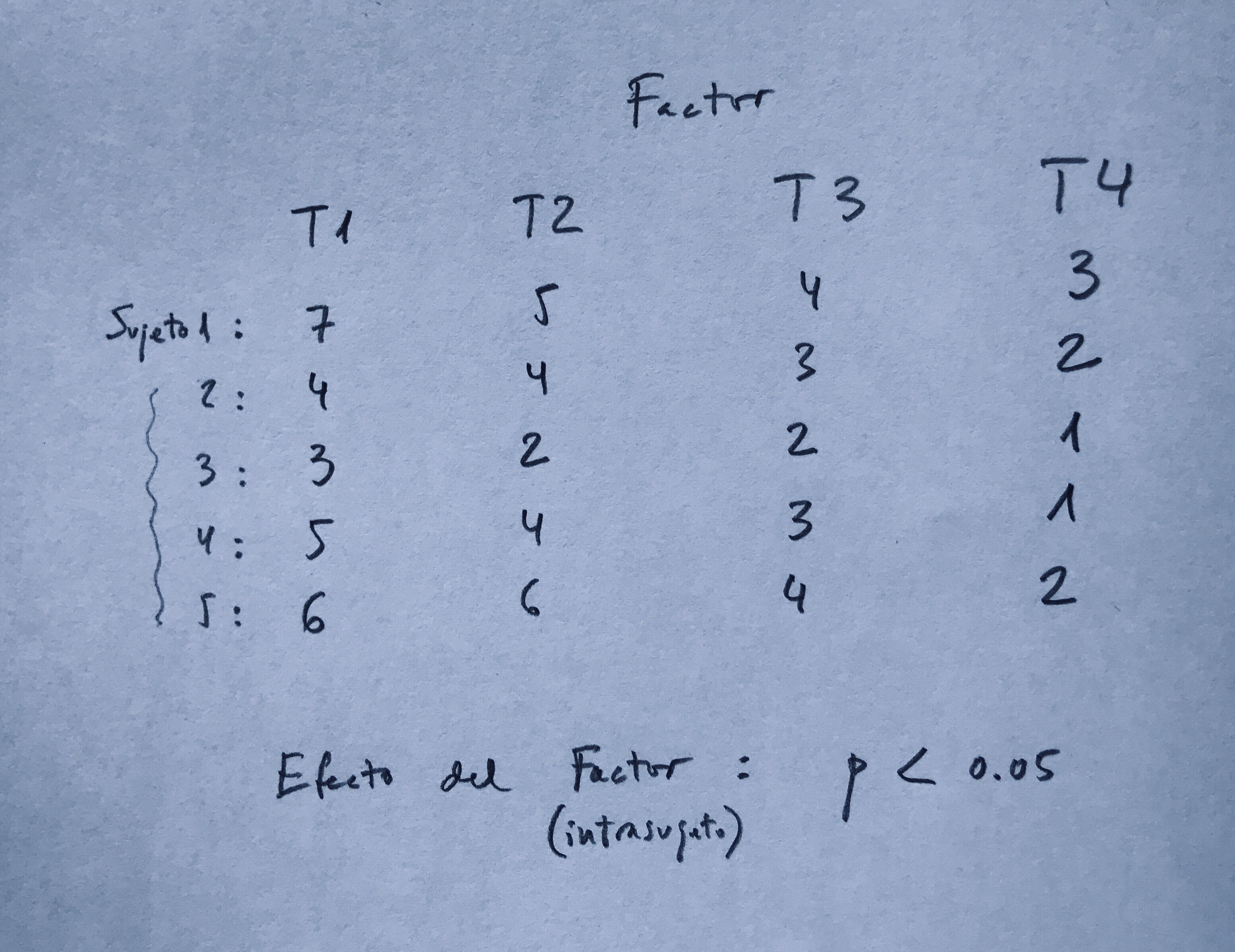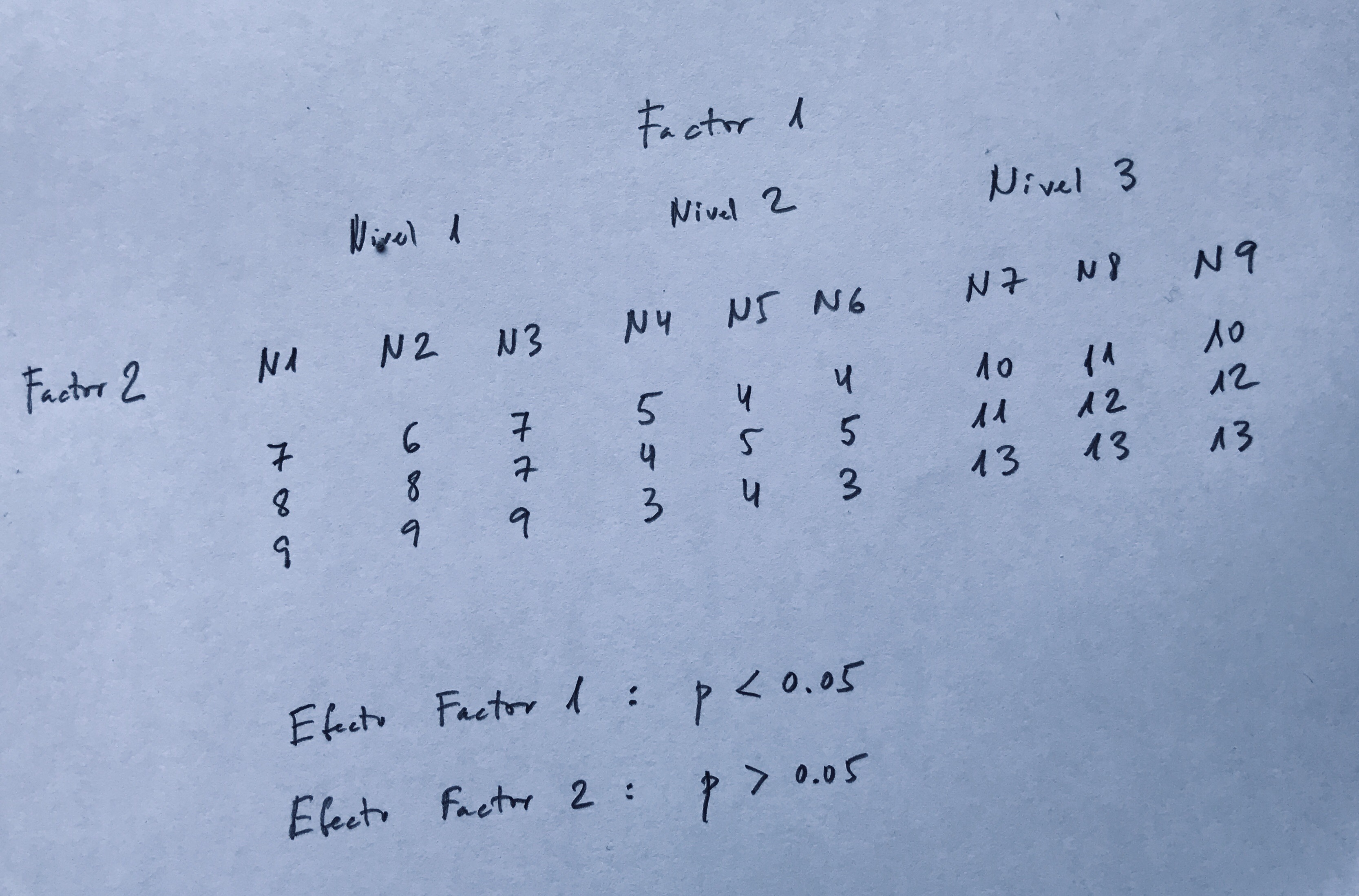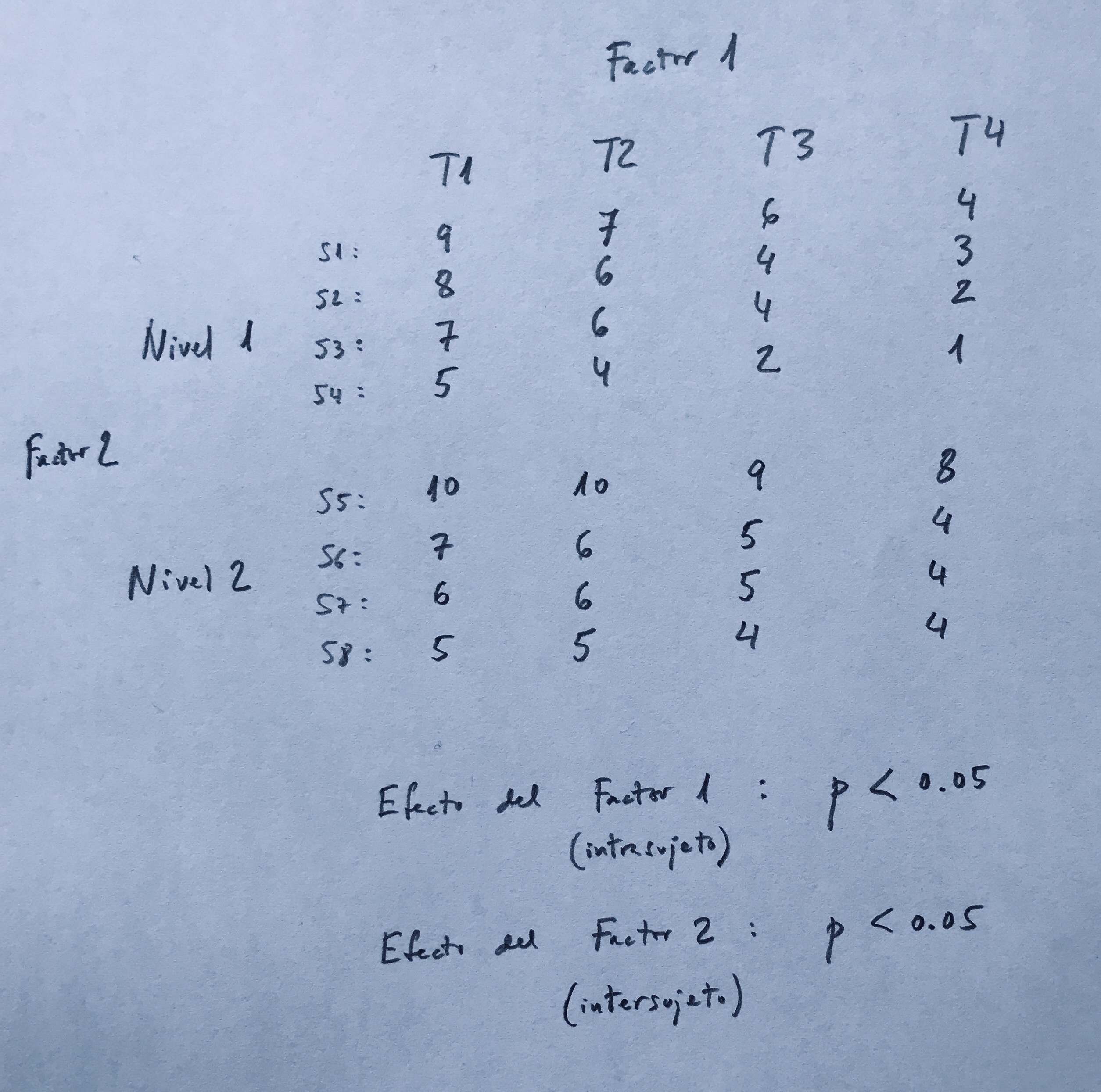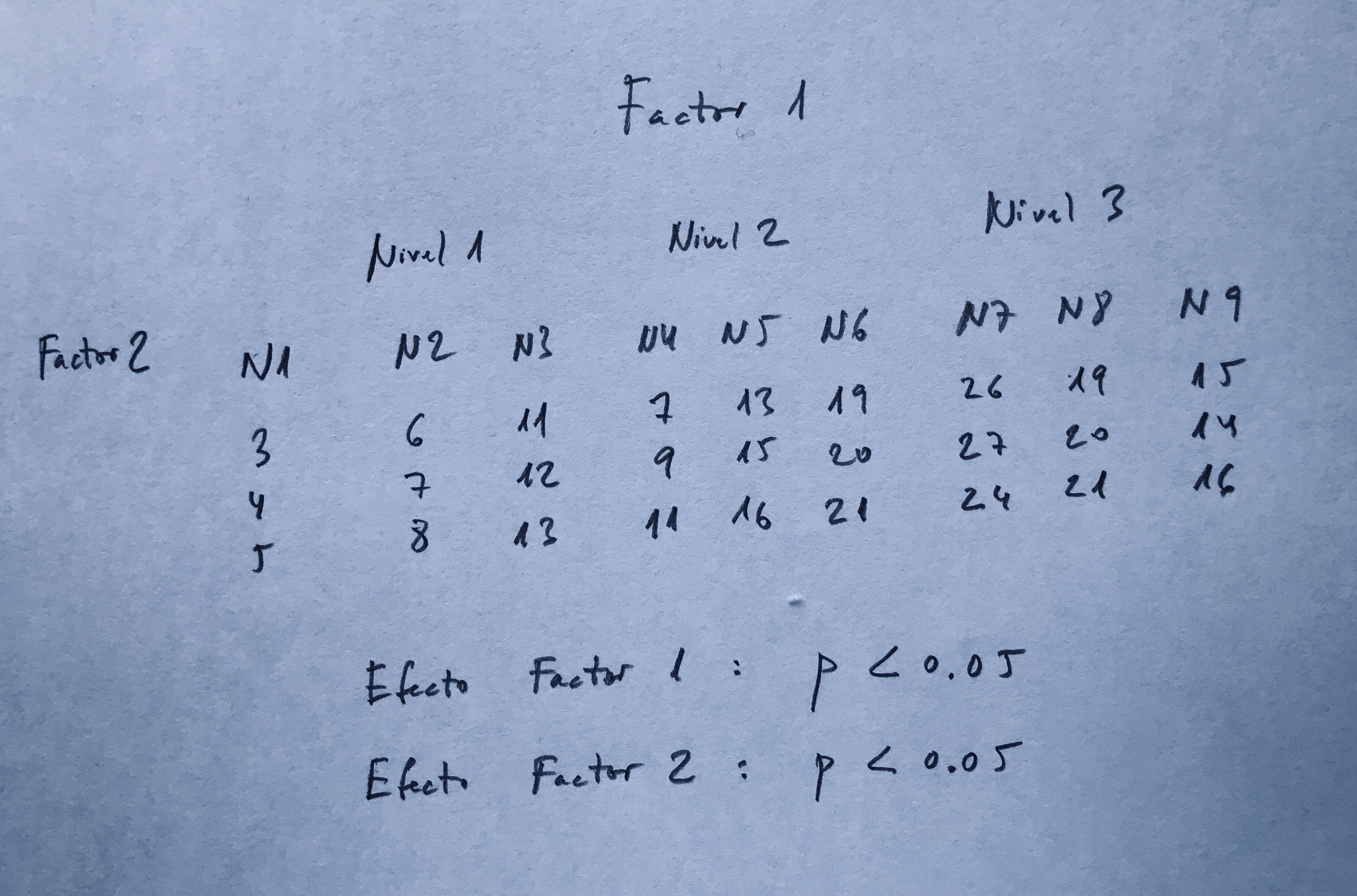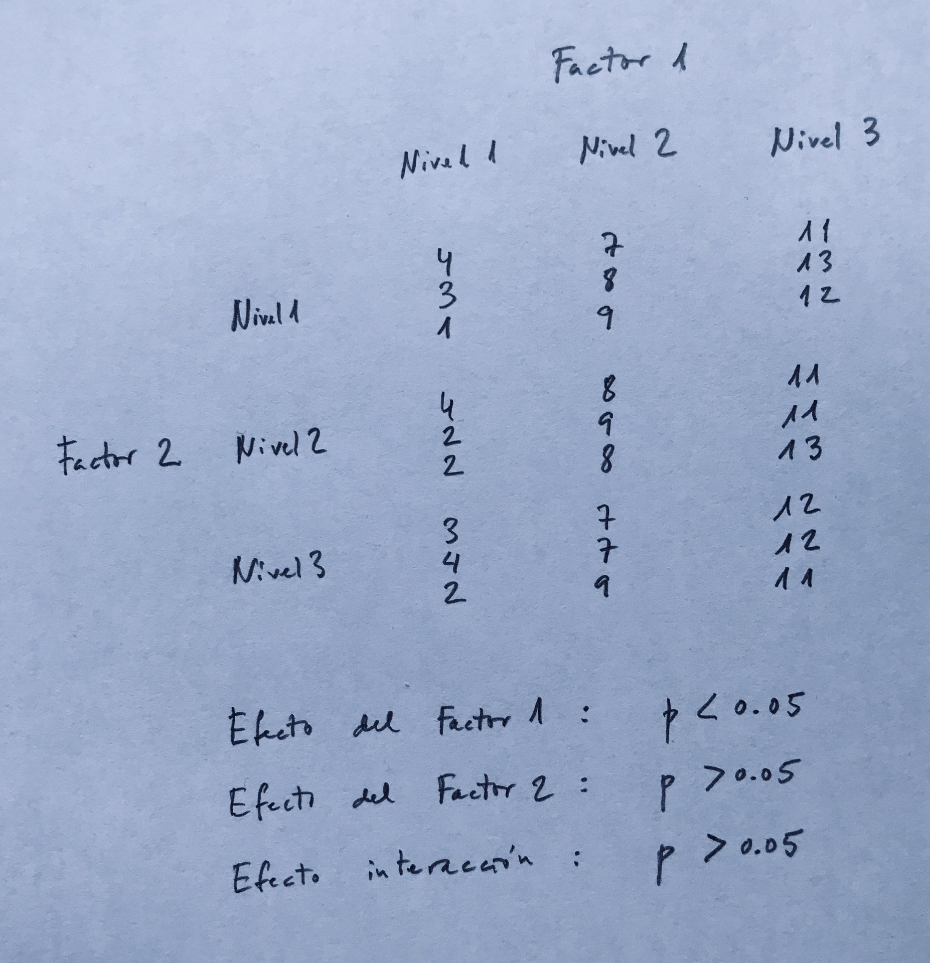 A continuación se podrán seguir una serie de ejemplos de ANOVA. Hay de factores cruzados, anidados. Factores intersujetos (los que no se mencionan expresamente), factores intrasujetos. Pueden verse los valores y los resultados que se obtendrían en los contrastes de hipótesis de los diferentes efectos a buscar en cada análisis. Recordemos que si el p-valor es menor de 0.05 se entiende que hay efecto del factor, significativo, lo que quiere decir que hay diferencia entre los niveles estudiados (si el factor es fijo) o entre la población de niveles de los que los niveles estudiados son una muestra (si el factor es aleatorio). Si el p-valor es mayor de 0.05 no hay efecto significativo, lo que quiere decir que las posibles diferencias muestrales que podamos ver entre los diferentes niveles no son extrapolables a la población.