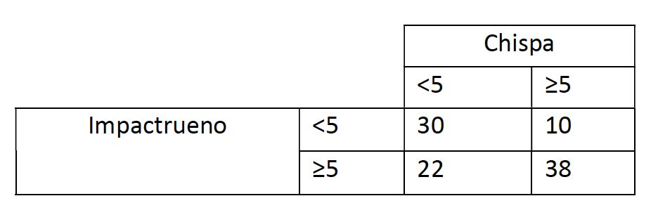 3. Un centro de investigación de energías naturales que pretende usar la electricidad de Chinchou bien cuidados en las mismas condiciones, decide hacer el siguiente estudio piloto. A un grupo de 100 Chinchou se les ha examinado mediante dos test de electricidad de distintos ataques eléctricos. En primer lugar, a 50 de ellos se les ha pedido que usen impactruenos en una diana con un voltímetro y a otros 50 que usen chispa en otras dianas con voltímetros. Una vez hecho el primer test, se les daban 4 horas de descanso a todos y, luego, cada Chinchou hacia el otro modelo de test. Cada test se evaluaba con un rango de 100 a 1000 voltios, pero, en realidad se quería ver si llegaban o no a los 500 voltios (>500 voltios= apto) con cada ataque porque lo que se quería ver era si el porcentaje de aptos sería el mismo o no usando diferentes ataques. Los resultados obtenidos fueron los siguientes: El ataque impactrueno el 60% fue apto y el ataque chispa el 48% lo fue, con este desglose por subgrupos de valores de la variable:
