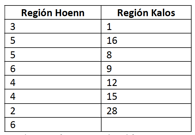 5. Estamos comparando la cantidad de Slowpoke atacados por la caza furtiva con el fin de comercializar sus colas como alimento que hubo en las regiones de Hoenn y Kalos. En Hoenn hubo 8 acontecimientos y en Kalos 7. Una vez completado los recuentos obtuvimos la siguiente tabla: