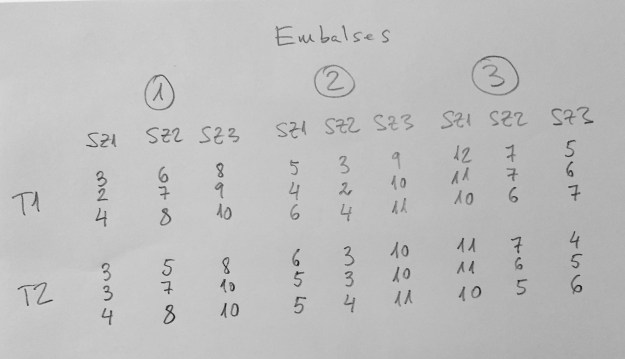 Supongamos que hemos tomado tres embalses españoles al azar con la voluntad de conocer la variabilidad que hay en ellos de un determinado contaminante. Tomamos tres subzonas en cada embalse para conocer la variabilidad interna dentro de los embalses. Queremos también conocer si las diferentes técnicas definidas para evaluar este contaminante presentan variación. Para ello elegimos dos de ellas al azar y las evaluamos por triplicado en cada muestra que tenemos. Los resultados son los siguientes: