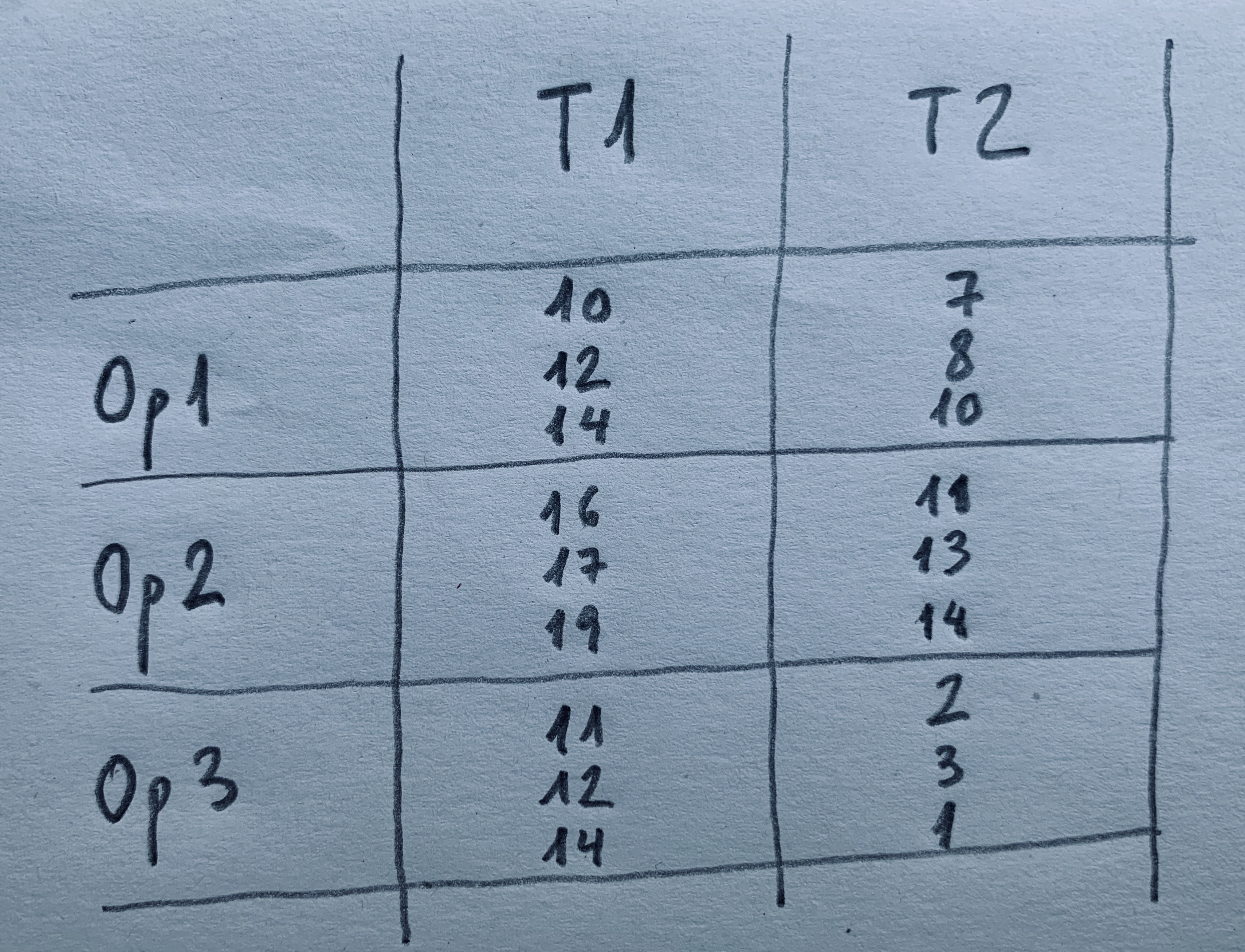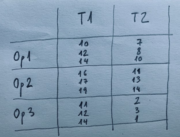 10.Hemos analizado la cantidad de biomasa en una zona en dos tiempos distintos (T1 y T2). El análisis lo han realizado tres operadores, tres analistas distintos que se quieren comparar. Cada muestra cada operario la analiza por duplicado. Los resultados son los siguientes: