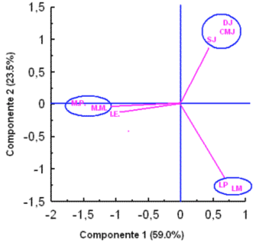 19.Hemos realizado un Análisis de componentes principales de un test que consta de cuatro ítems. Hemos hecho una representación de los pacientes con sus iniciales en las dos primeras componentes principales:
