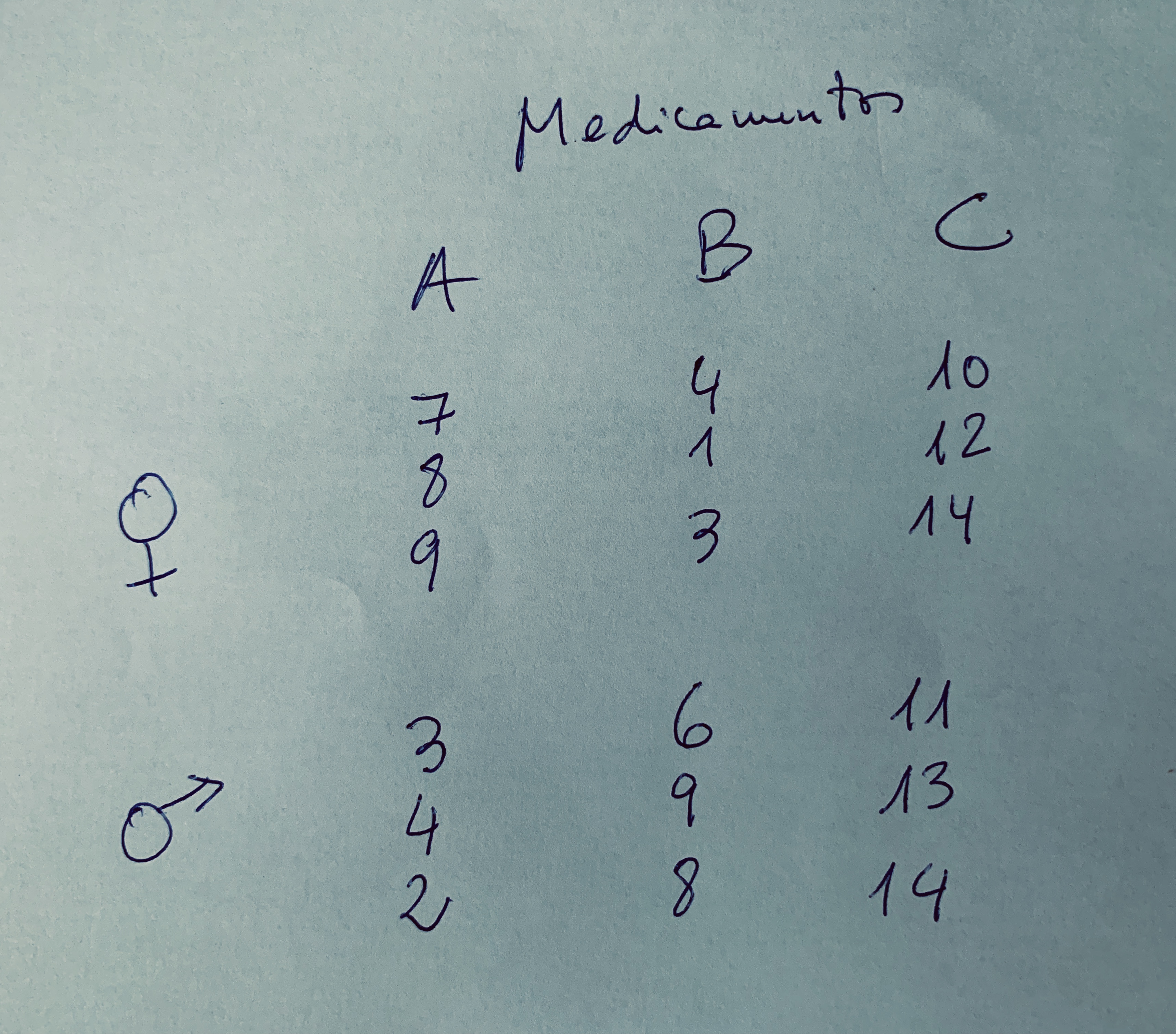 12.Tenemos los siguientes datos en un estudio donde se aplican tres medicamentos distintos (A, B y C) a un grupo de pacientes que tienen una determinada patología y que se han diferenciado en hombres y mujeres. Con los datos obtenidos se pretende ver la diferencia entre tratamientos, entre sexos y si hay o no interacción. ¿Cuál es la afirmación más razonable respecto a los resultados que podríamos obtener en el ANOVA?: