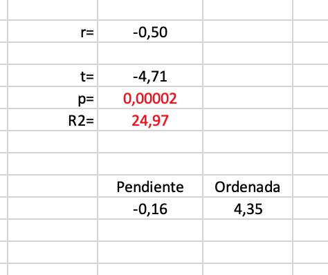 Hay correlación significativa, pero con una capacidad predictiva muy baja (24,97%). La ecuación sería: