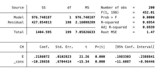 La correlación es positiva y con valor 0.8339, significativa, porque en la regresión que vemos a continuación el p-valor de la correlación coincide con la de la pendiente de la recta; o sea, una p<0.001. La regresión es la siguiente: