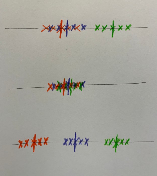 Nos podemos encontrar con cosas como las siguientes. Veremos a continuación tres situaciones distintas donde se están comparando, en cada una de ellas, tres muestras de tres poblaciones. Si observamos un poco atentamente nos encontraremos con situaciones bien distintas que llevan a intuiciones muy distintas acerca de cómo deben ser las poblaciones que hay detrás de esas muestras: