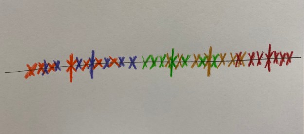 Primero: La posición relativa de esas medias. Miremos estas tres distintas situaciones, donde representamos los valores de las muestras con una cruz en la posición que ocupan en la recta numérica: