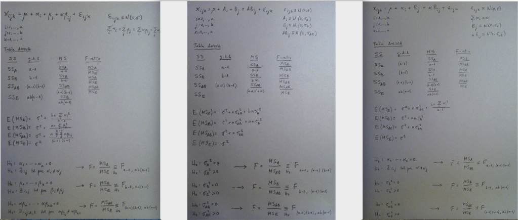 Comparemos los tres modelos con su parametrización, tabla ANOVA, esperanzas de los cuadrados medios, contrastes de hipótesis: