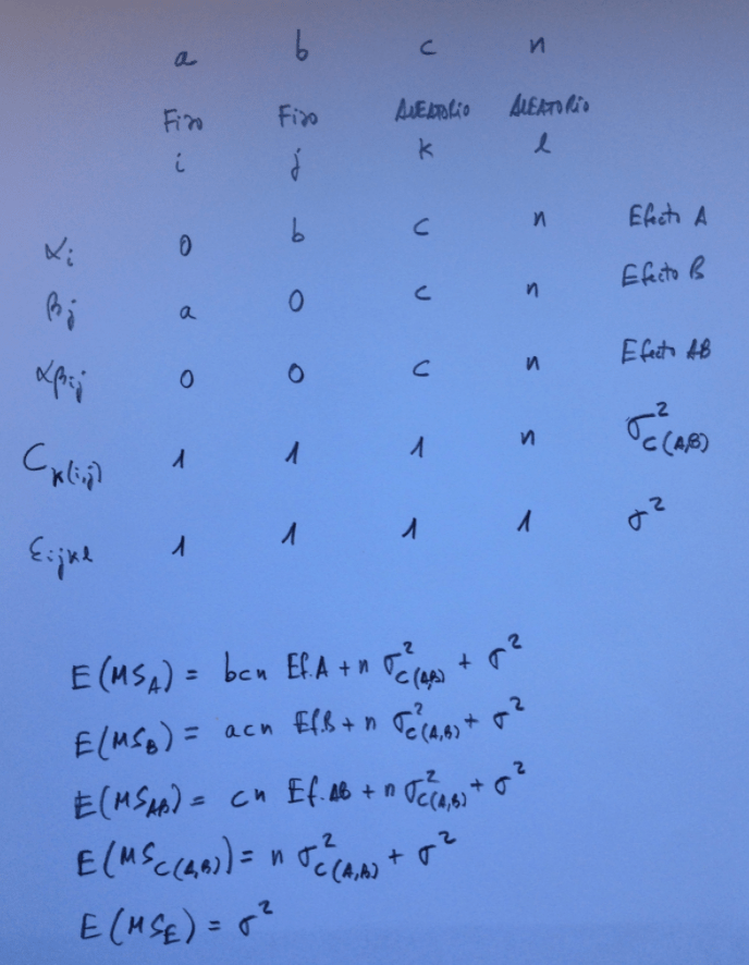 Hay cuatro efectos y, por lo tanto, cuatro contrastes de hipótesis. Los estadísticos de test se pueden deducir fácilmente de estas esperanzas de los cuadrados medios.