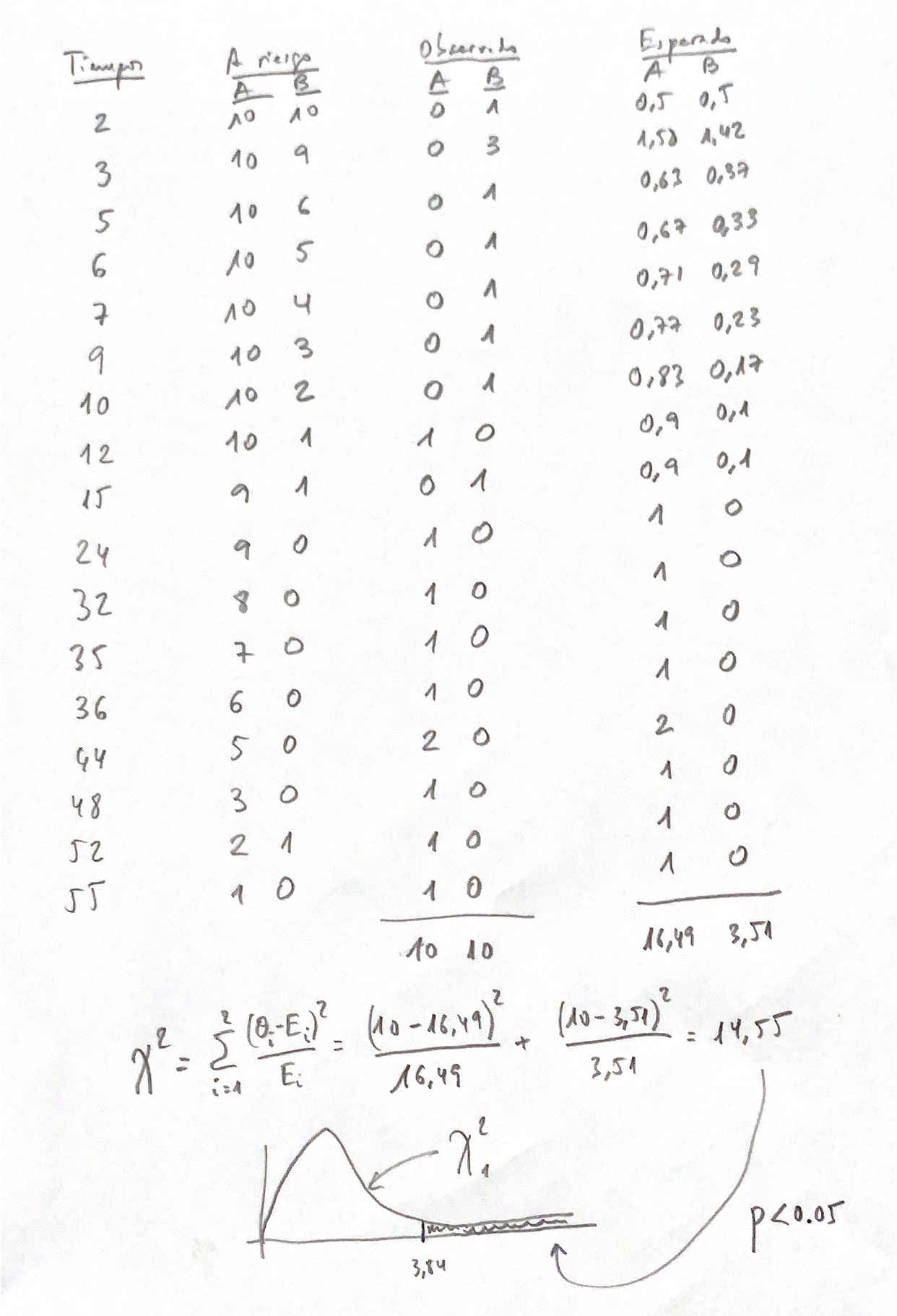 Hay cuatro efectos y, por lo tanto, cuatro contrastes de hipótesis. Los estadísticos de test se pueden deducir fácilmente de estas esperanzas de los cuadrados medios.