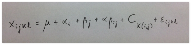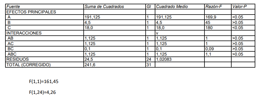 Se trata de una ANOVA de tres factores, dos fijos y un tercero aleatorio anidado en la interacción.
