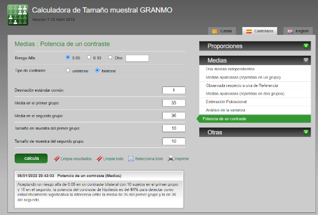 17.Estamos comparando la salinidad de dos zonas marinas. Tenemos el siguiente cálculo de potencia estadística de la comparación muestral: