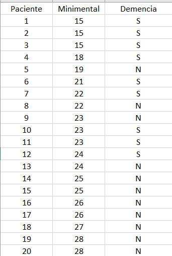 Se han seguido 20 pacientes que por edad y por referencias familiares, de amigos o vecinos, era indicado pasarles un Minimental. El Gold standard fue el diagnóstico definitivo que daban en un Centro de Neurología especializado, al cual se remitiron los 20 pacientes.