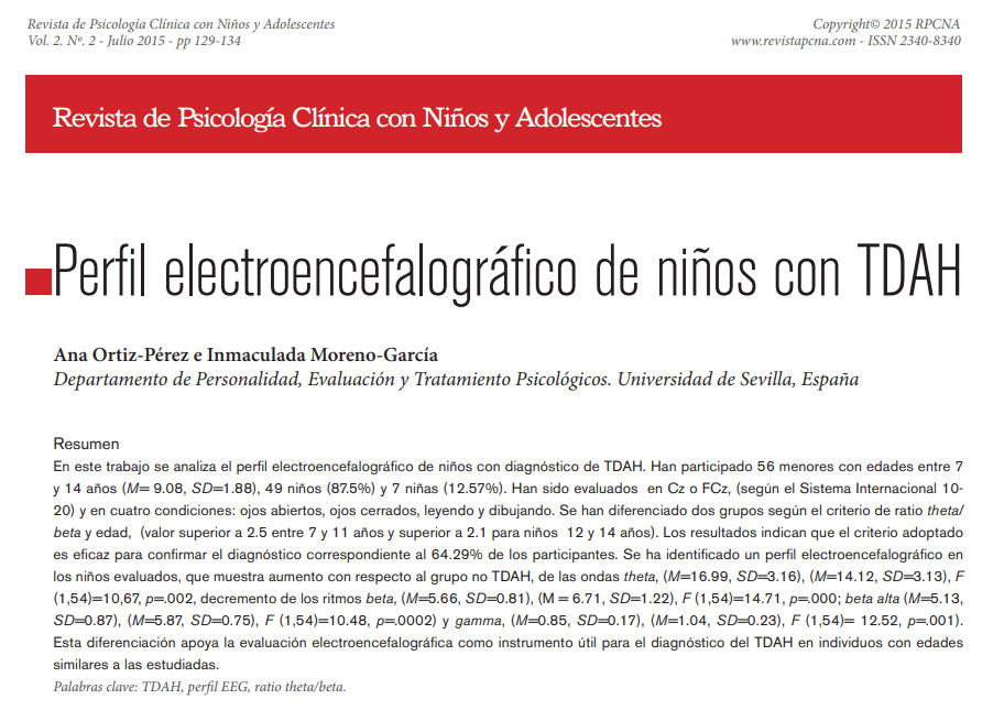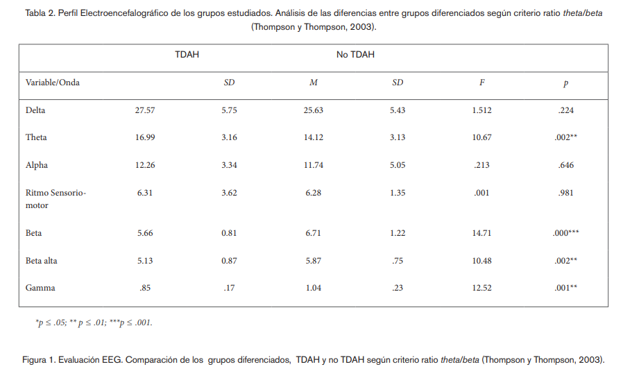 se comparan niños y niñas con TDAH y niños y niñas controles mediante su perfil electroencefalográfico. En este perfil se miden muchas variables y la siguiente tabla 2 del artículo muestra un resumen de ellas en ambos grupos: