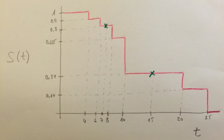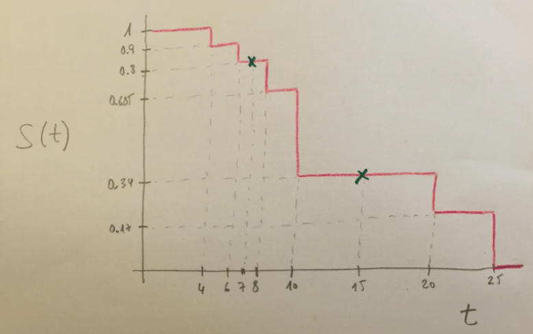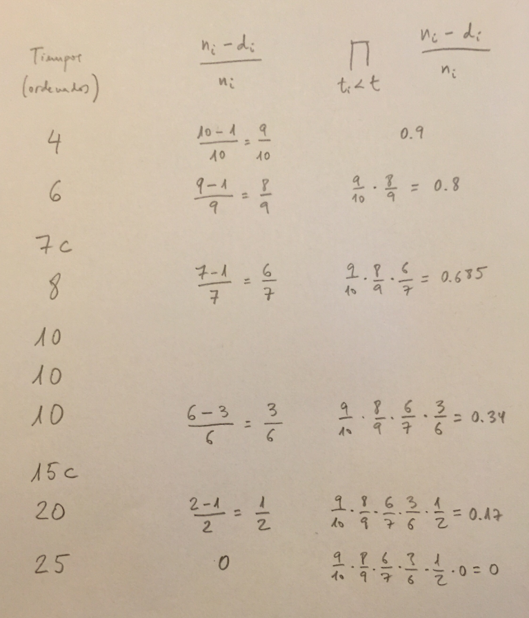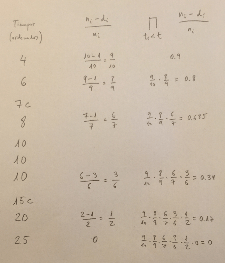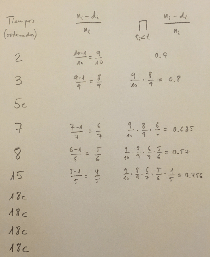 35. Curva de supervivencia Deja un comentario KM=Kaplan-Meier Supongamos la siguiente muestra: (4, 6, 7c, 8, 10, 10, 10, 15c, 20, 25) Supongamos esta otra muestra: (2, 3, 5c, 7, 8, 15, 18c, 18c, 18c, 18c) Comparte esto: Compartir en X (Se abre en una ventana nueva) X Comparte en Facebook (Se abre en una ventana nueva) Facebook Me gusta Cargando...