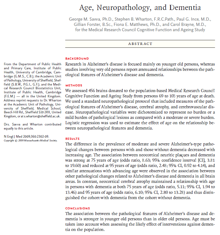 se trata de buscar elementos de distintas partes del cerebro en necropsias tras la muerte, a dos edades distintas (75 y 95 años) de pacientes con Demencia. Se comparan cerebros de donantes que mueren a esas edades, unos con Demencia y otros Controles.