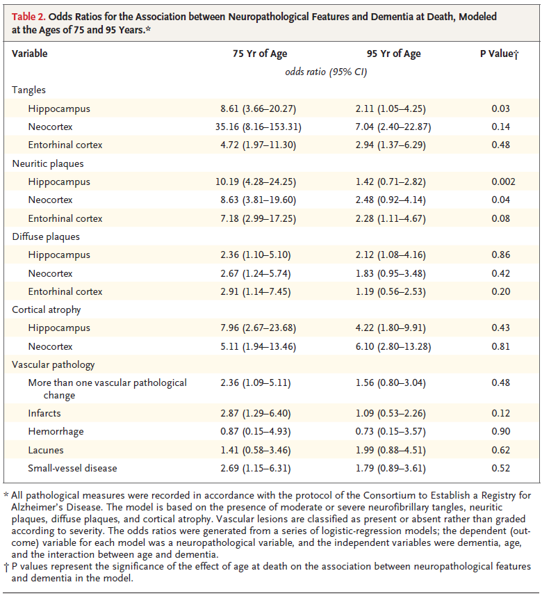 Establecer, a partir de esta tabla, cuáles son los principales diferencias estructurales entre los cerebros de una persona con Demencia y una sin Demencia, a los 75 años y a los 95 años.