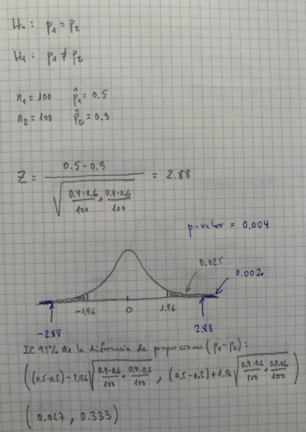 46. Test e Intervalo de confianza de la diferencia de proporciones Deja un comentario Test de comparación de dos proporciones: Test exacto de Fisher: Test de McNemar: Comparte esto: Compartir en X (Se abre en una ventana nueva) X Comparte en Facebook (Se abre en una ventana nueva) Facebook Me gusta Cargando...