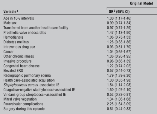 Escribe al lado de cada una de las siguientes Odds ratio el p-valor correspondientes (p<0.05 ó p>0.05). Estas Odds ratio son de la relación de cada una de estas variables con la mortalidad en infecciones del corazón.